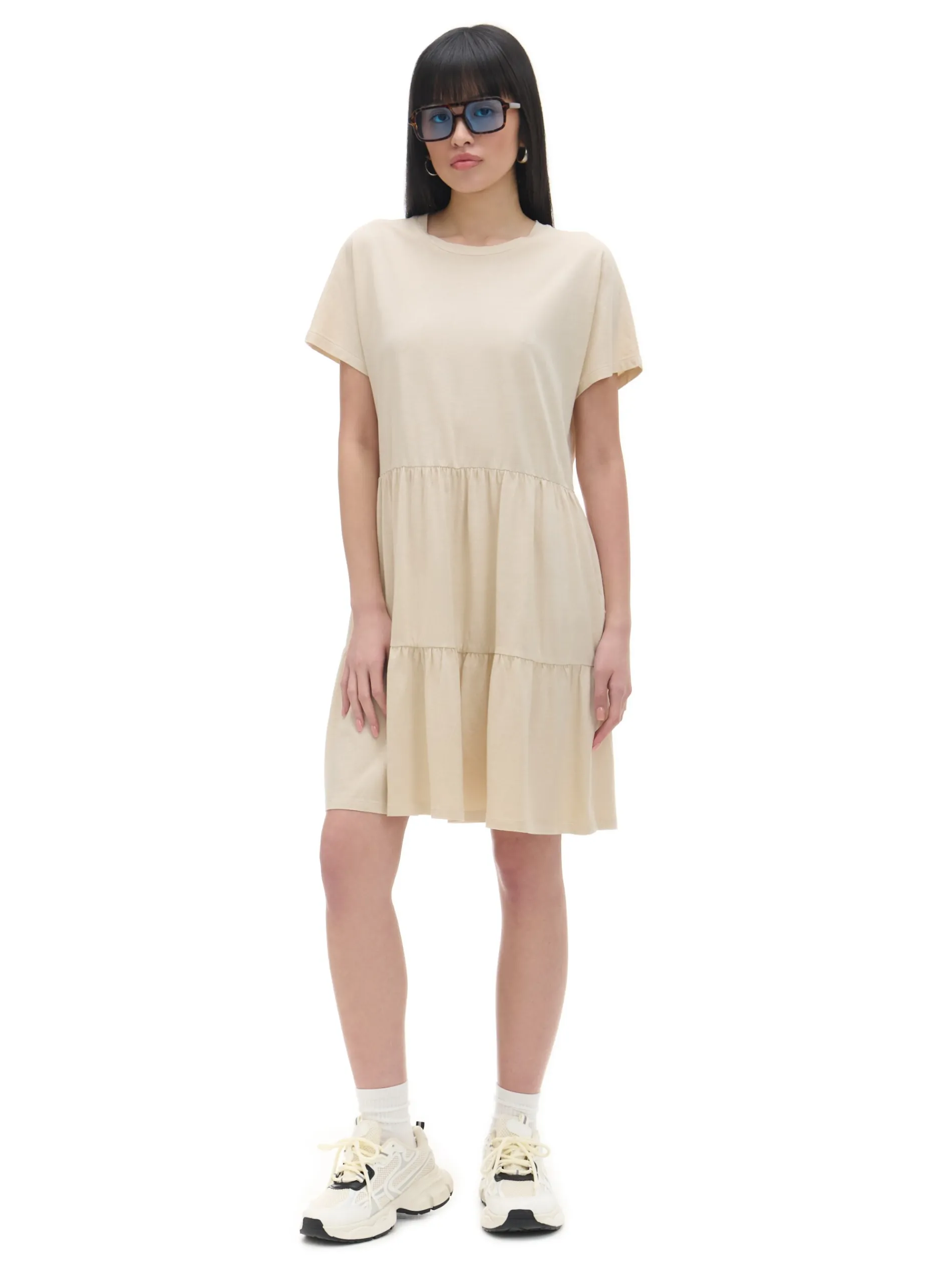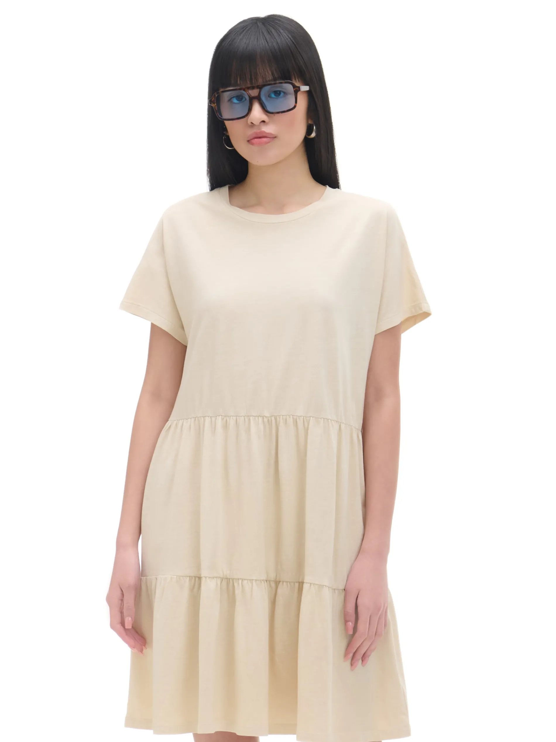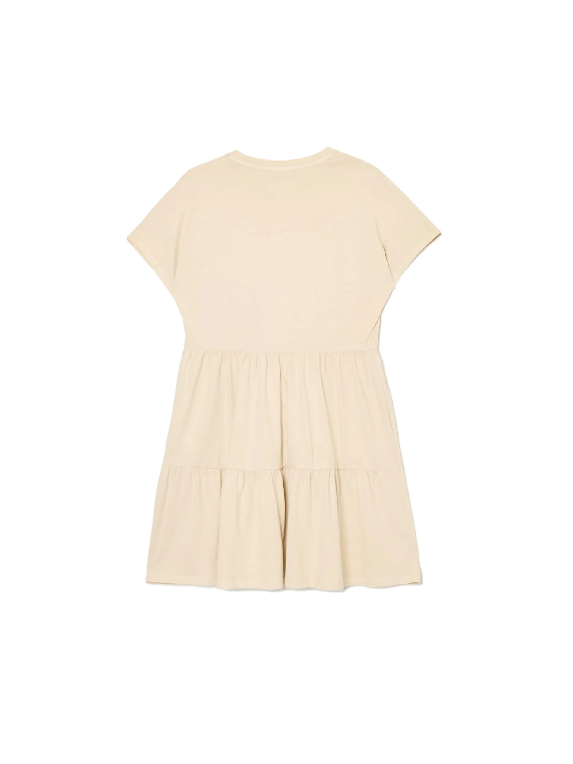Bawełniana sukienka mini w jasnym odcieniu z ozdobnymi falbanami i marszczeniami. Fituje z każdym rodzajem obuwia! 100% bawełny długość mini proste, krótkie rękawy ozdobne falbany i marszczenia Wzrost modelki: 168 cm