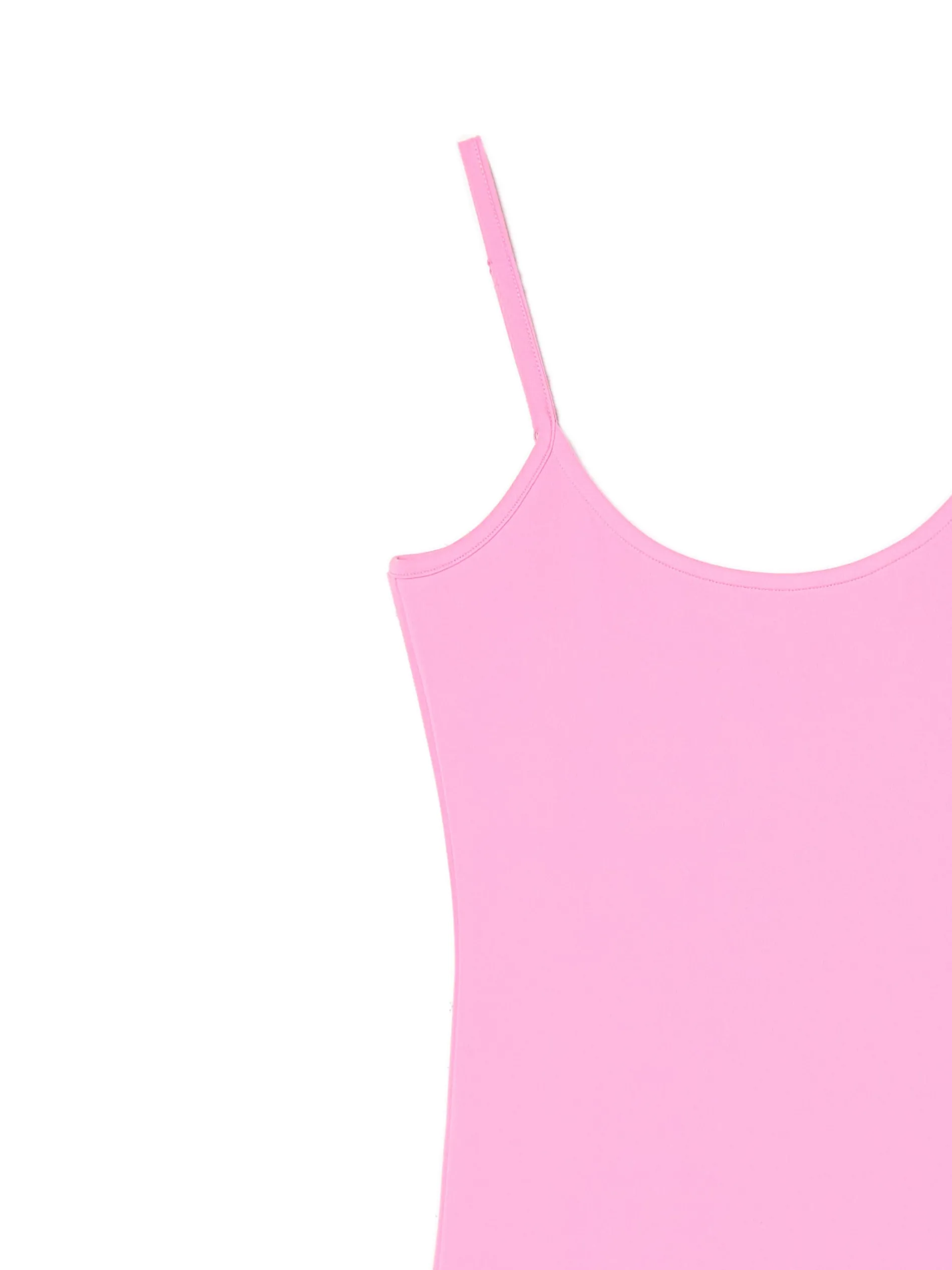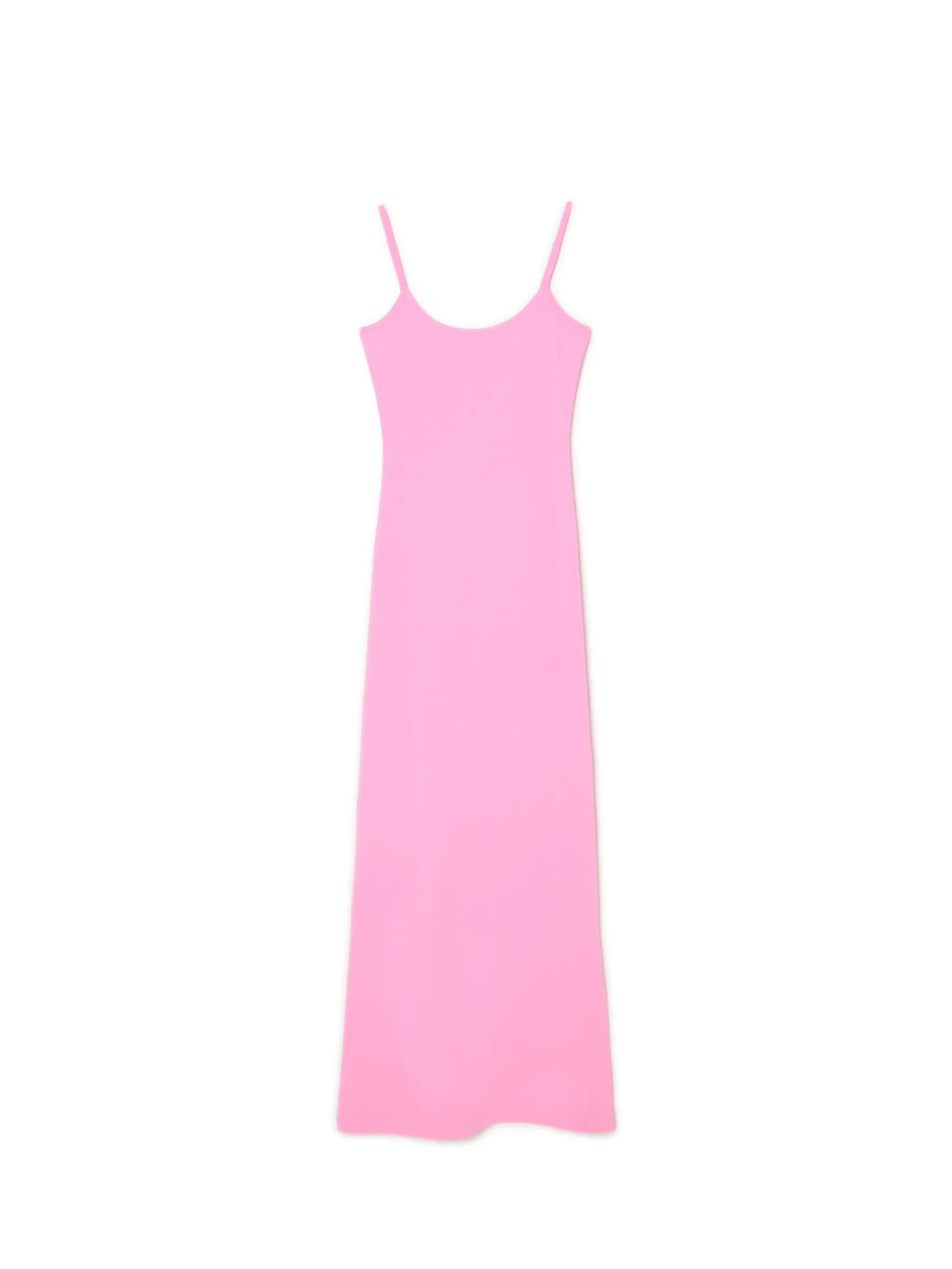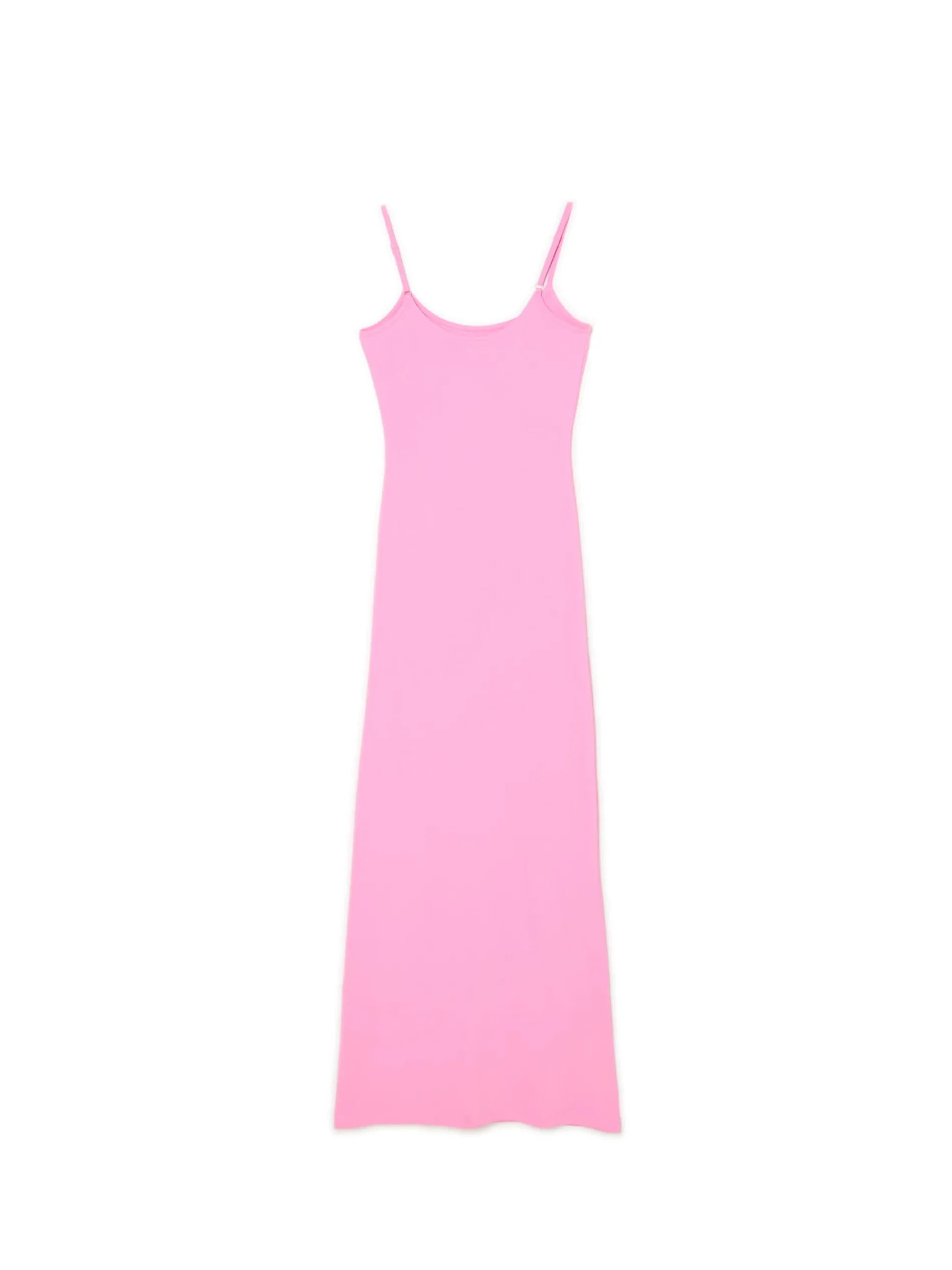 Długa sukienka, uszyta z różowej dzianiny. dzianina z domieszką elastycznych włókien długość maxi dopasowany krój podkreślający sylwetkę okrągły dekolt wąskie ramiączka z regulacją długości