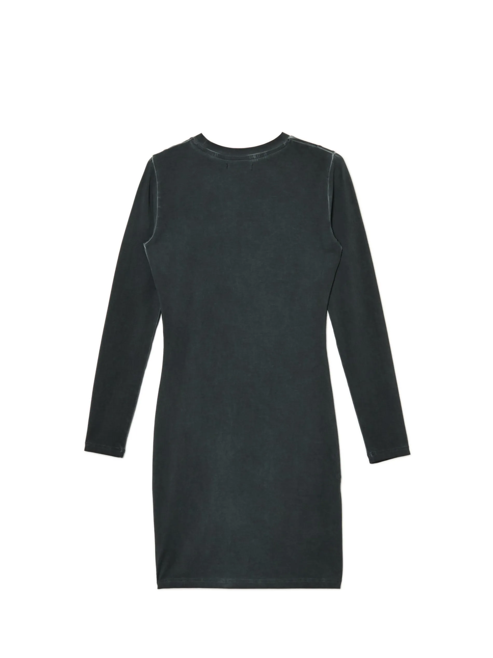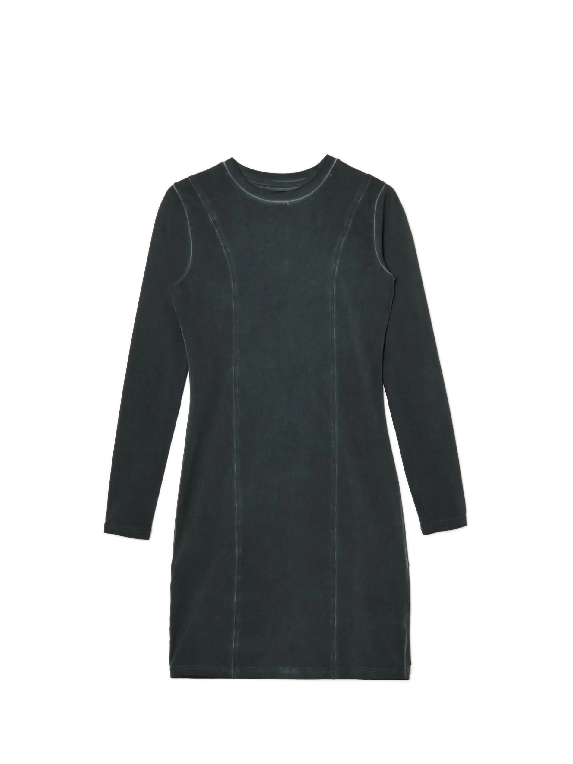 Damska sukienka uszyta z bawełny z domieszką elastycznych włókien. Ozdobą tego modelu jest efekt sprania na całości metodą oil wash. bawełna z dodatkiem elastycznych włókien dopasowany krój podkreślający sylwetkę długość mini zabudowany, okrągły dekolt z lamówką długie, dopasowane rękawy ozdobne przeszycia efekt sprania oil wash