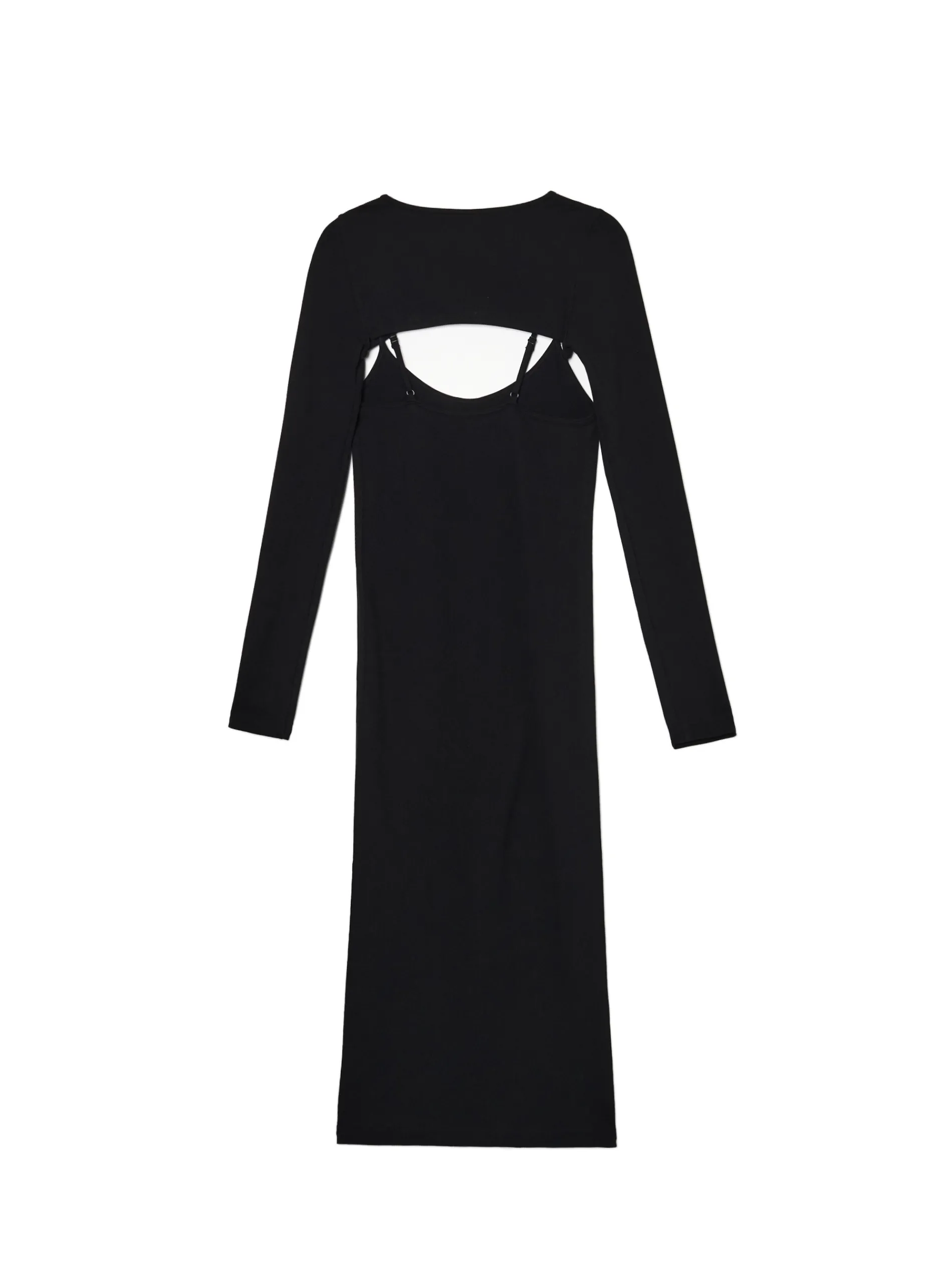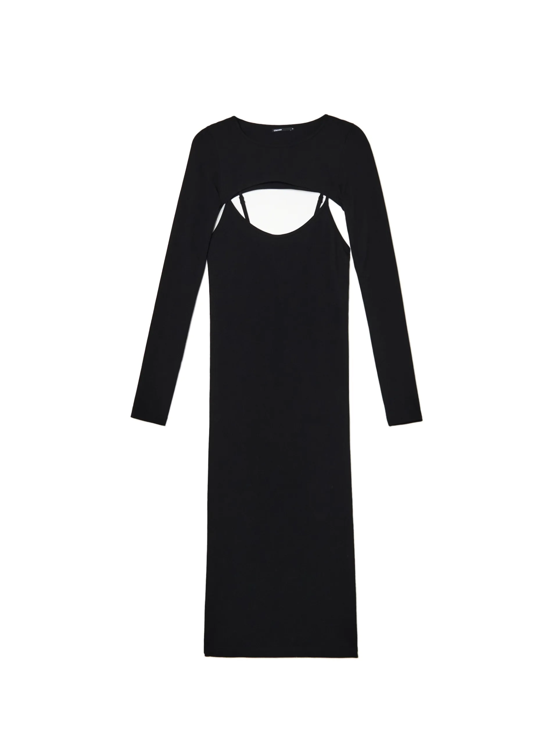 Czarna sukienka damska o długości maxi, uszyta mieszanki materiałów o gładkiej teksturze. Ten model po założeniu tworzy efektowne wycięcia na przodzie i plecach. materiał z dodatkiem elastycznych włókien długość midi i dopasowany krój głęboki dekolt wąskie ramiączka z regulacją długości długie, dopasowane rękawy rozcięcie z boku Wzrost modelki: 177 cm