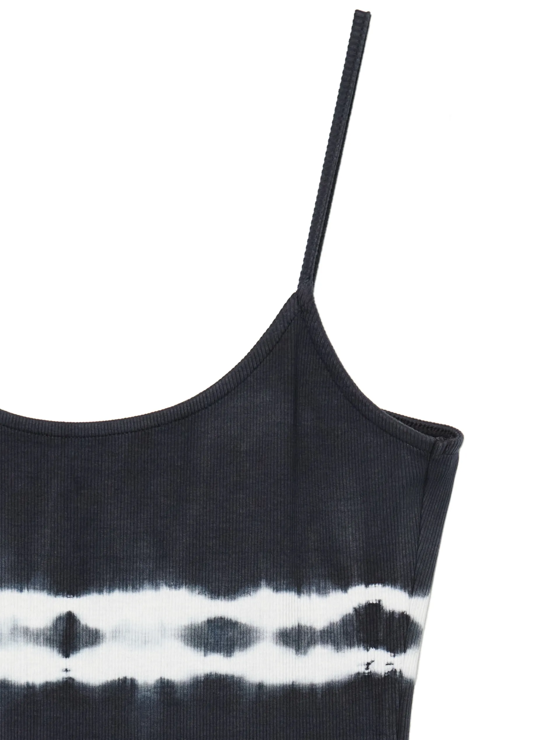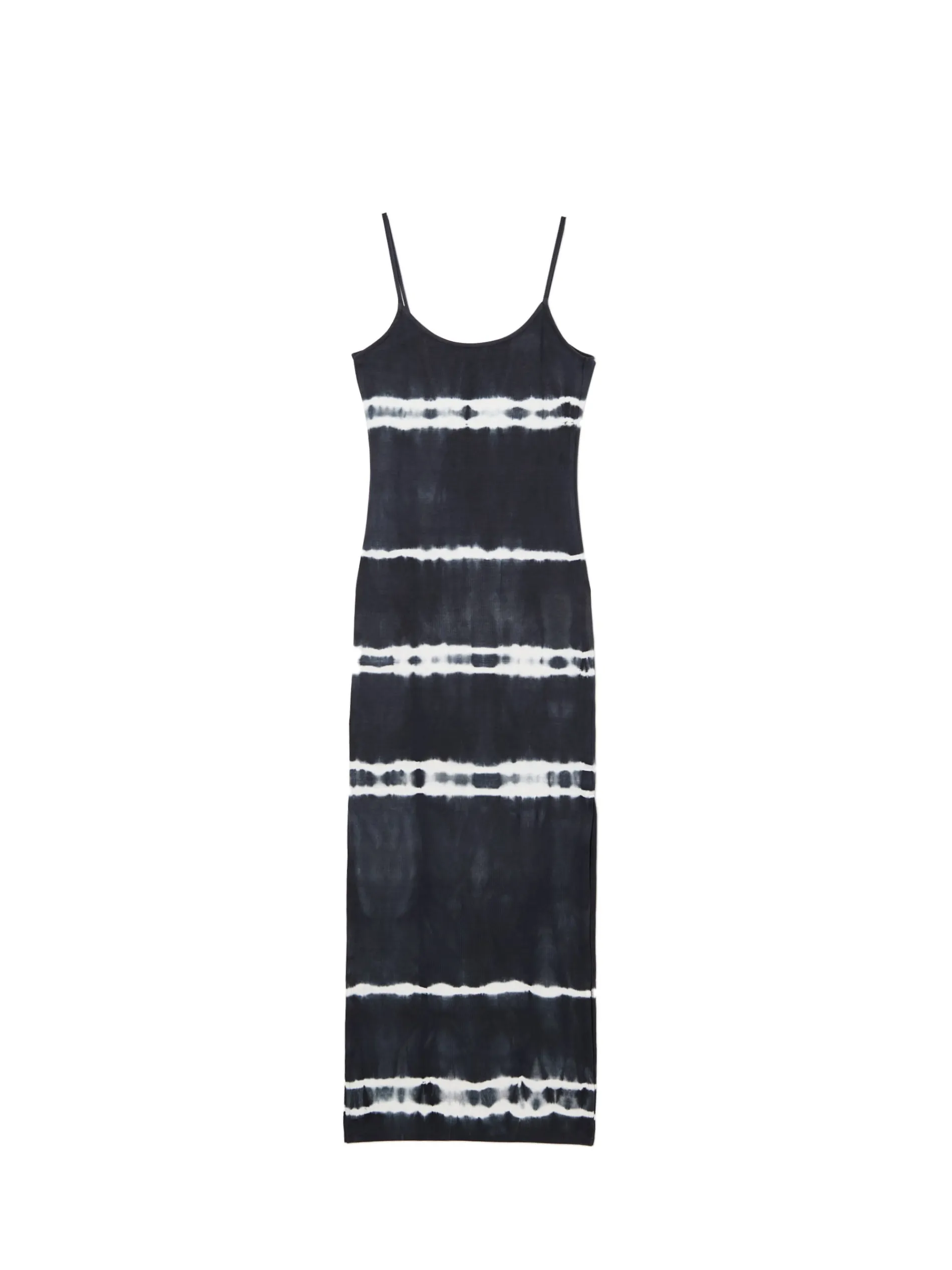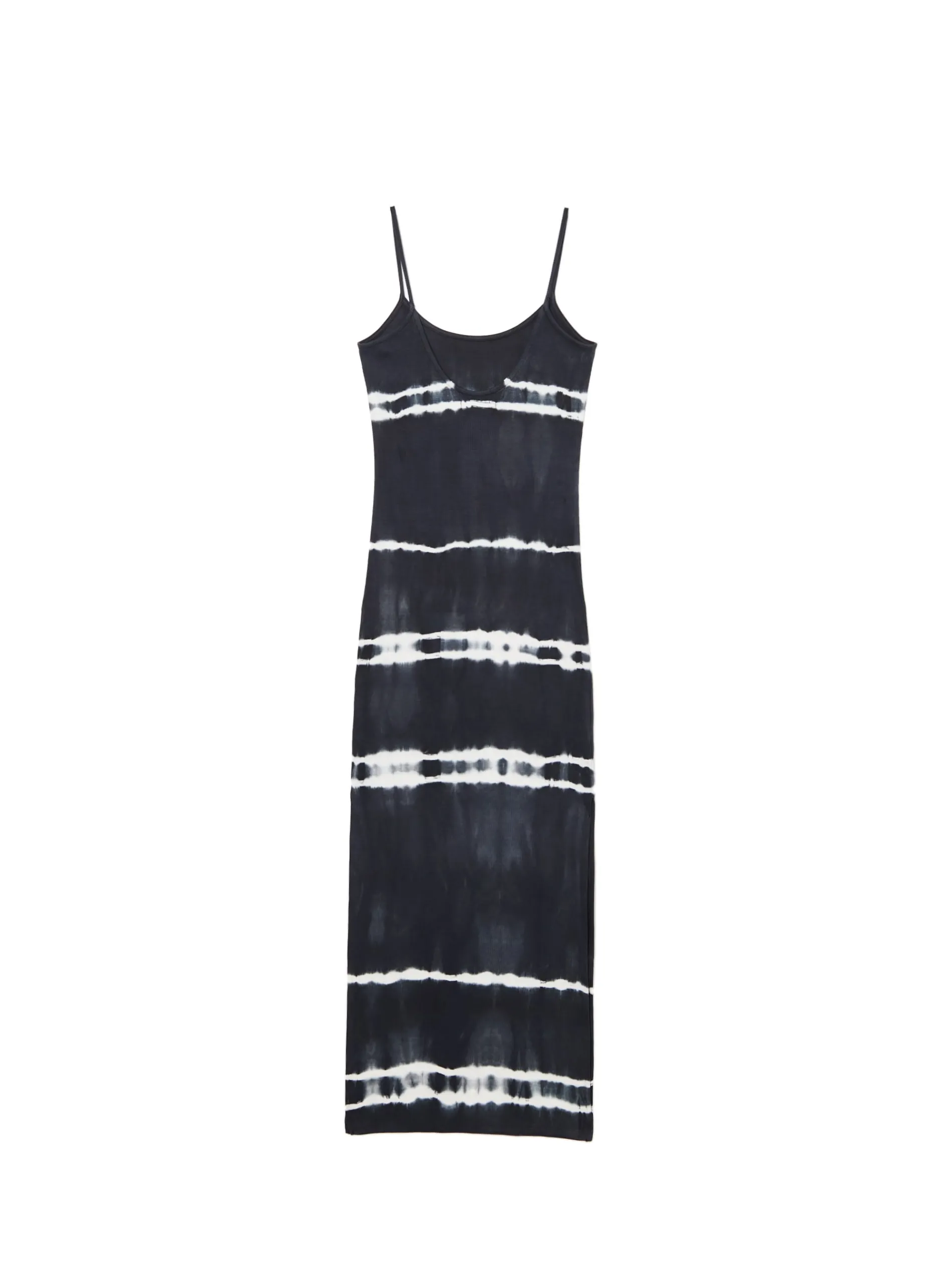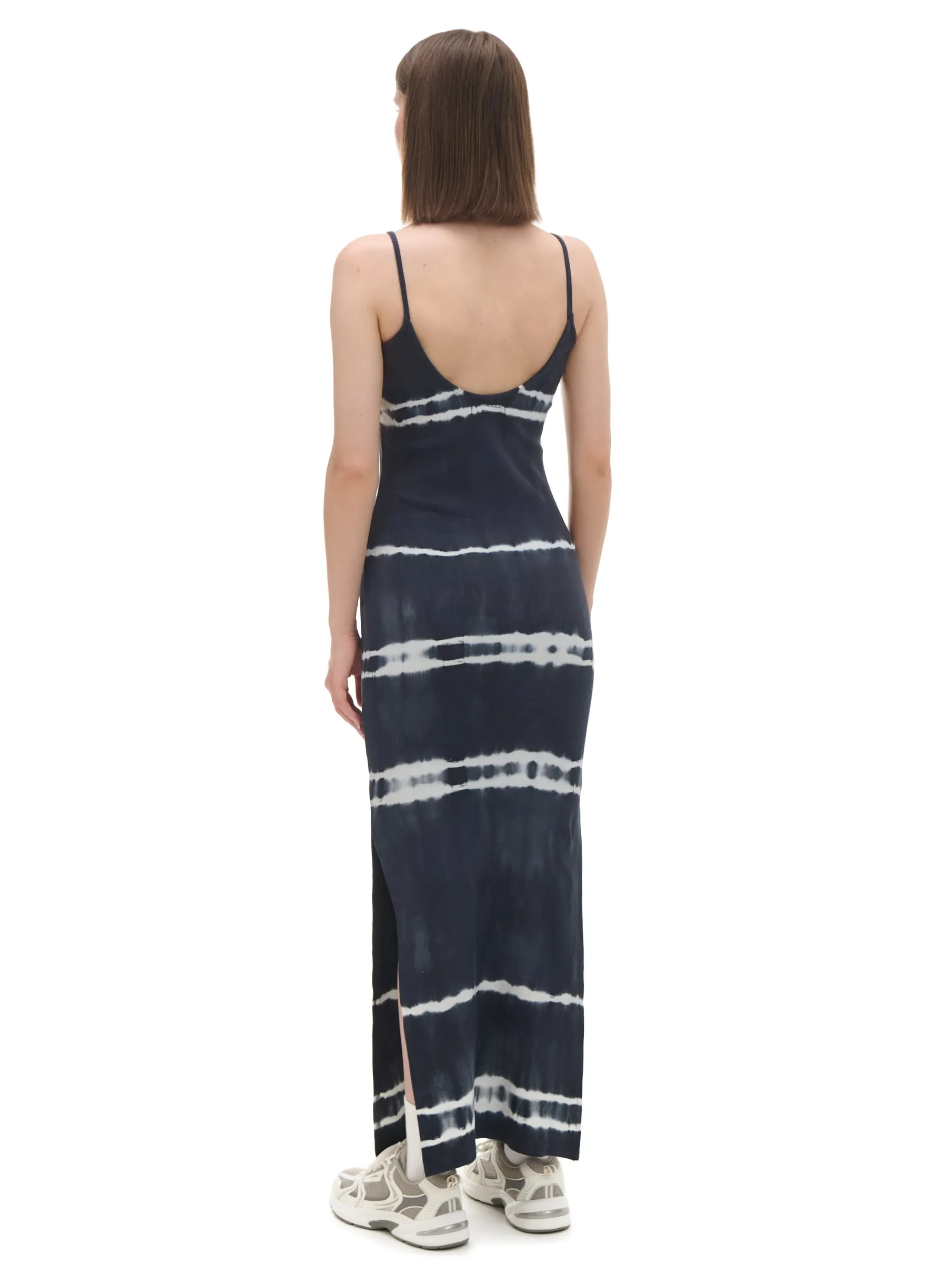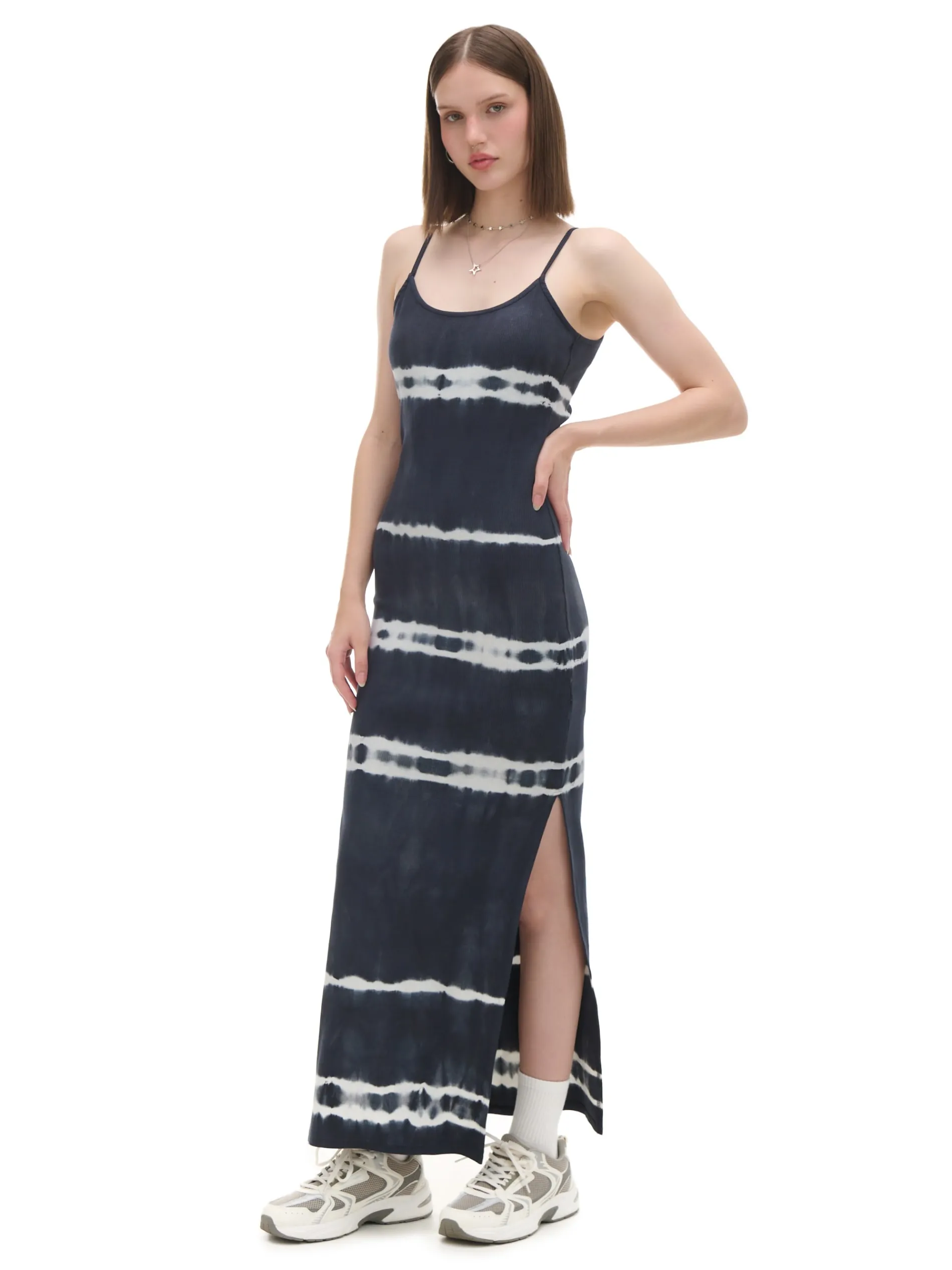 Sukienka uszyta z bawełnianej dzianiny z dodatkiem elastycznych włókien. Nadruk z efektem tie-dye, głęboki dekolt na plecach i praktyczne wycięcia na nogi to tylko nieliczne z zalet tego itema! długość maxi i dopasowany krój cienkie ramiączka dekolt na plecach rozcięcia po bokach efekt tie-dye w paski na całości Wzrost modelki: 172 cm