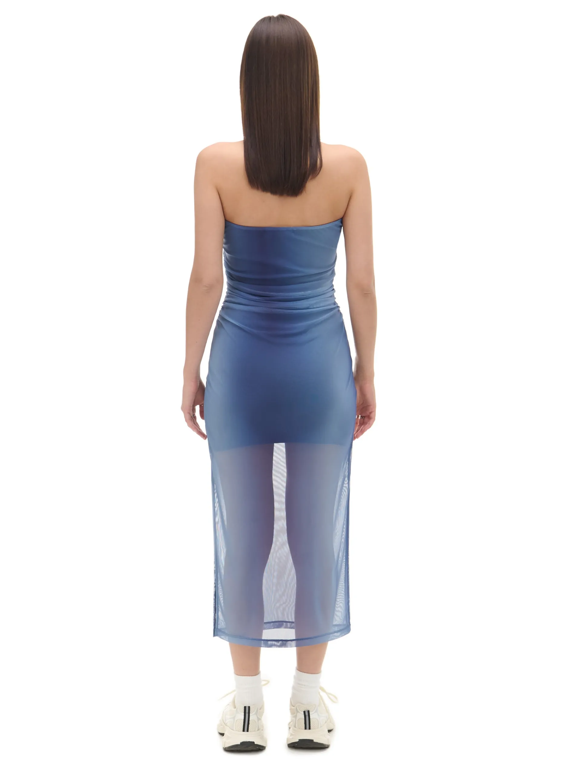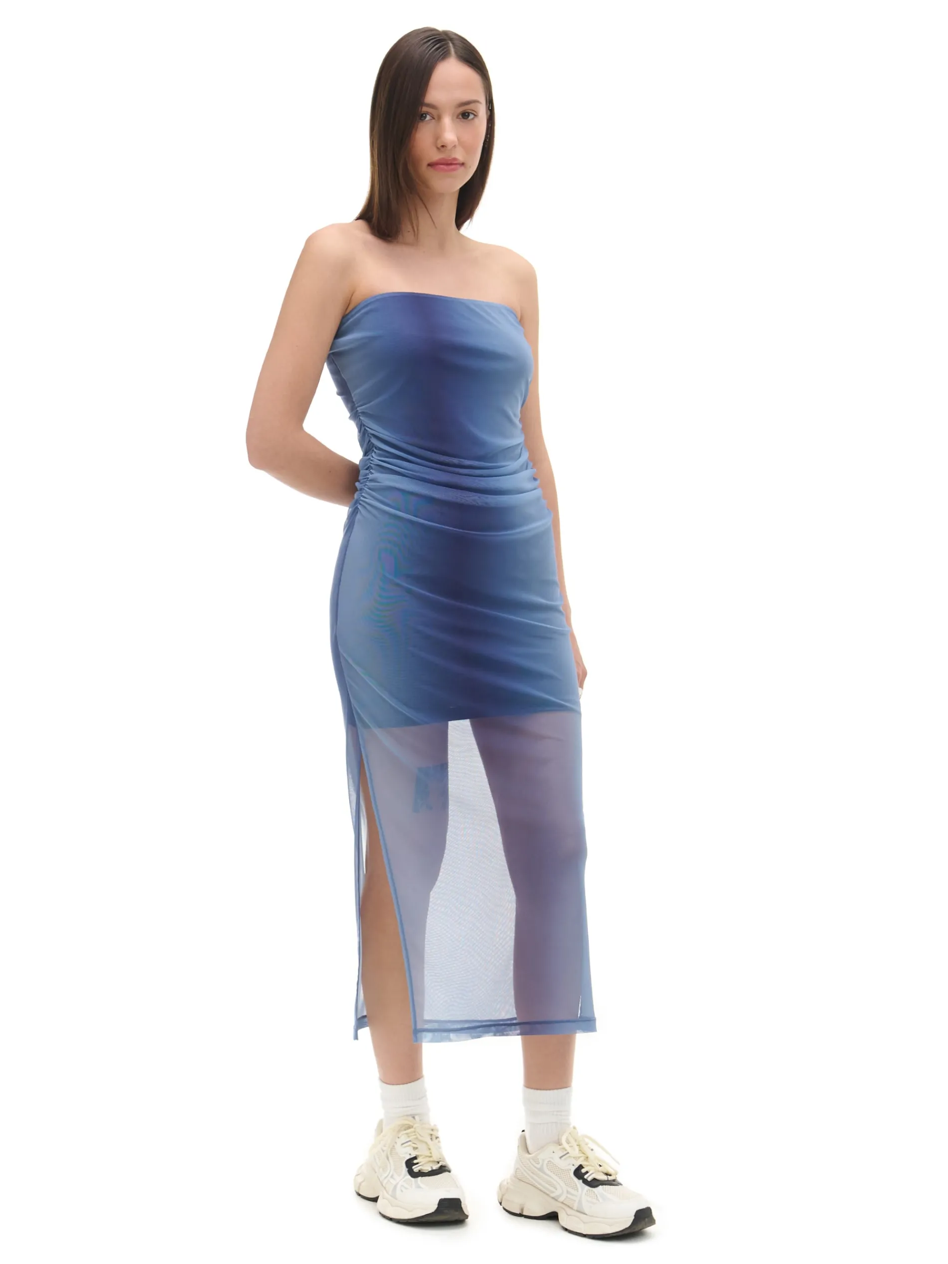 Dopasowana sukienka uszyta z lekkiego materiału w niebieskim odcieniu z dodatkiem elastycznych włókien. Symetryczne marszczenia i ten artystyczny print wyróżnią Cię w tłumie! dzianina z domieszką elastycznych włókien dopasowany krój podkreślający sylwetkę bez rękawów dekoracyjne marszczenie pod biustem wewnątrz wykończenie na podszewce nadruk all over
