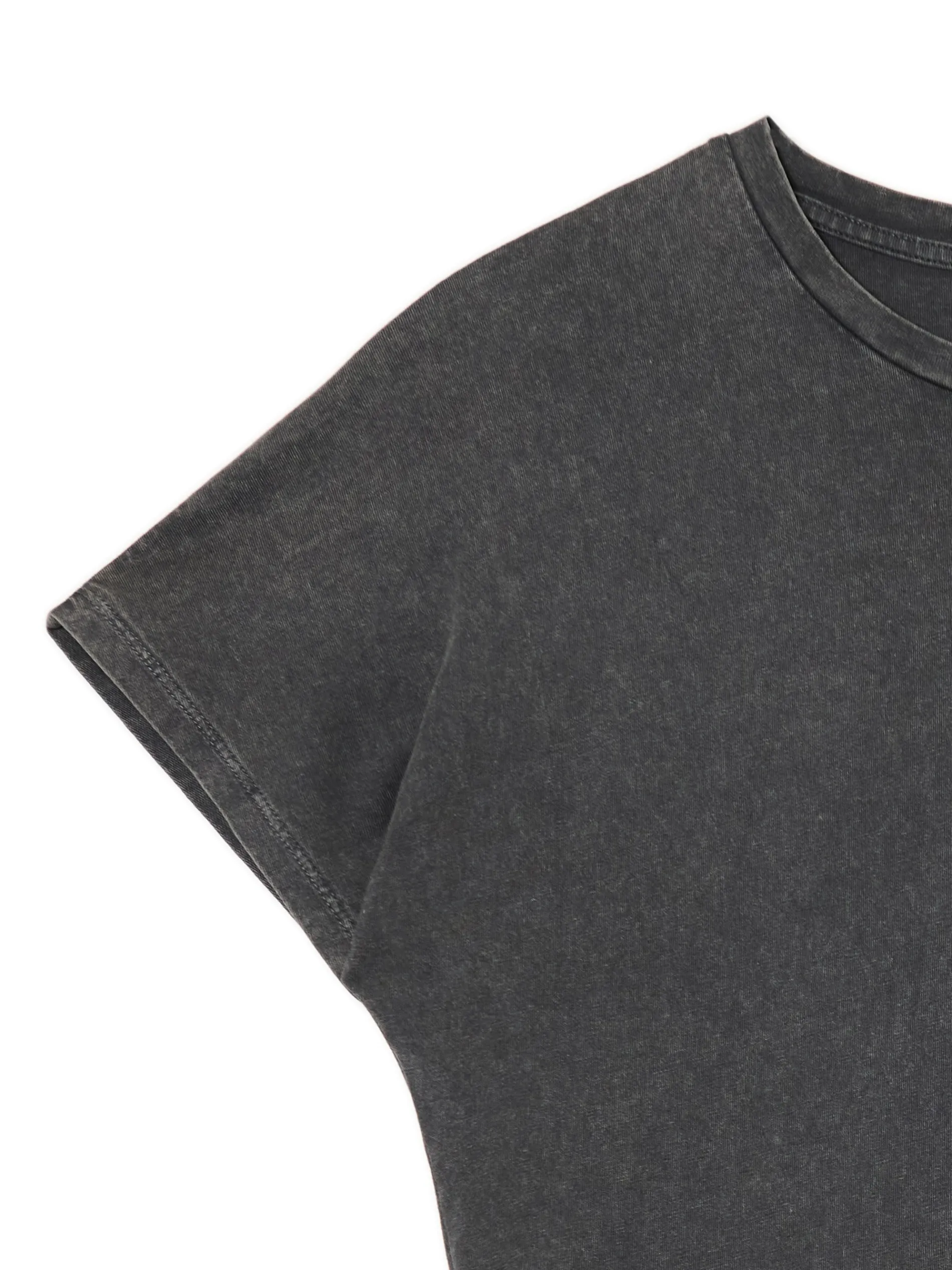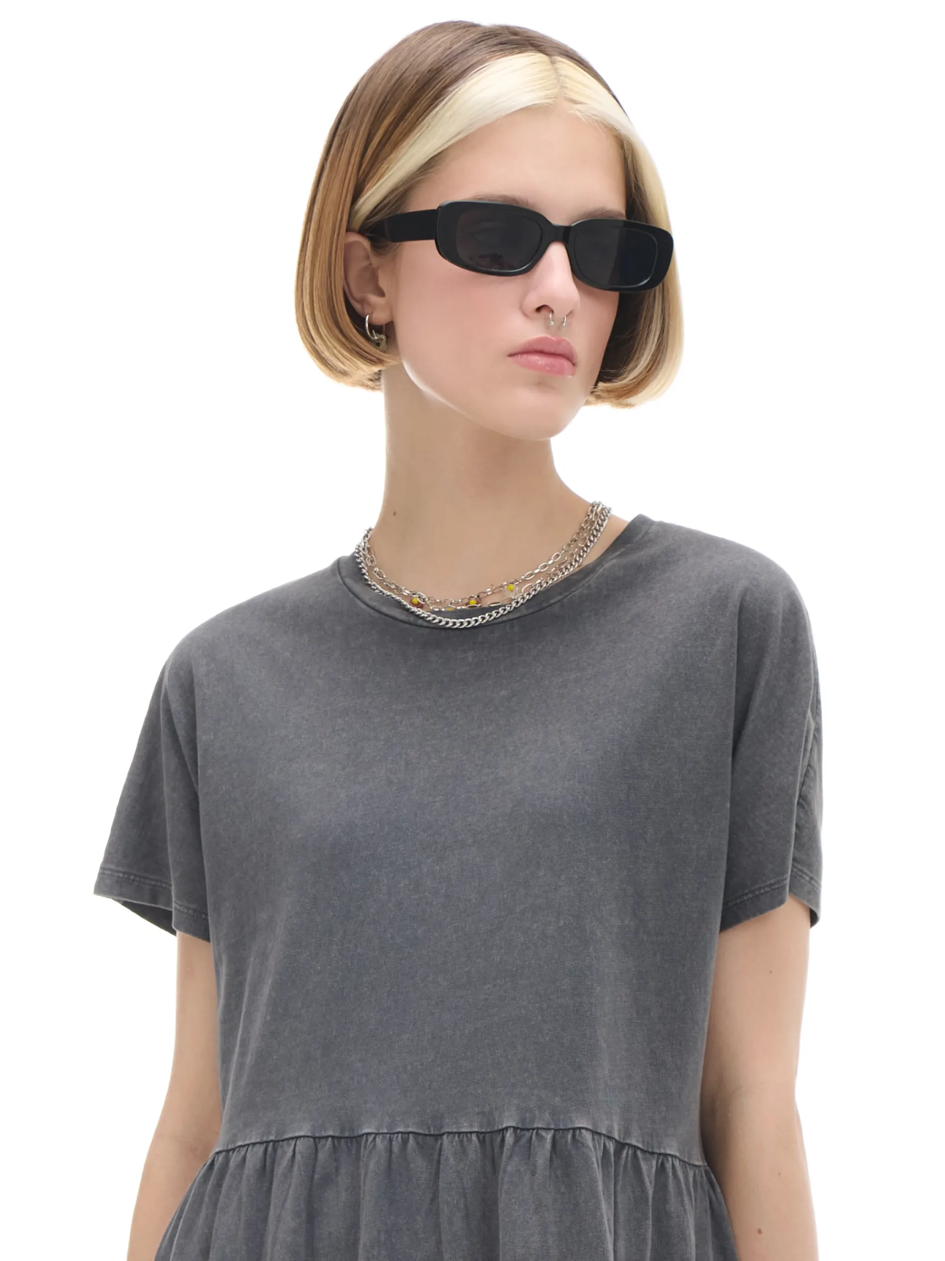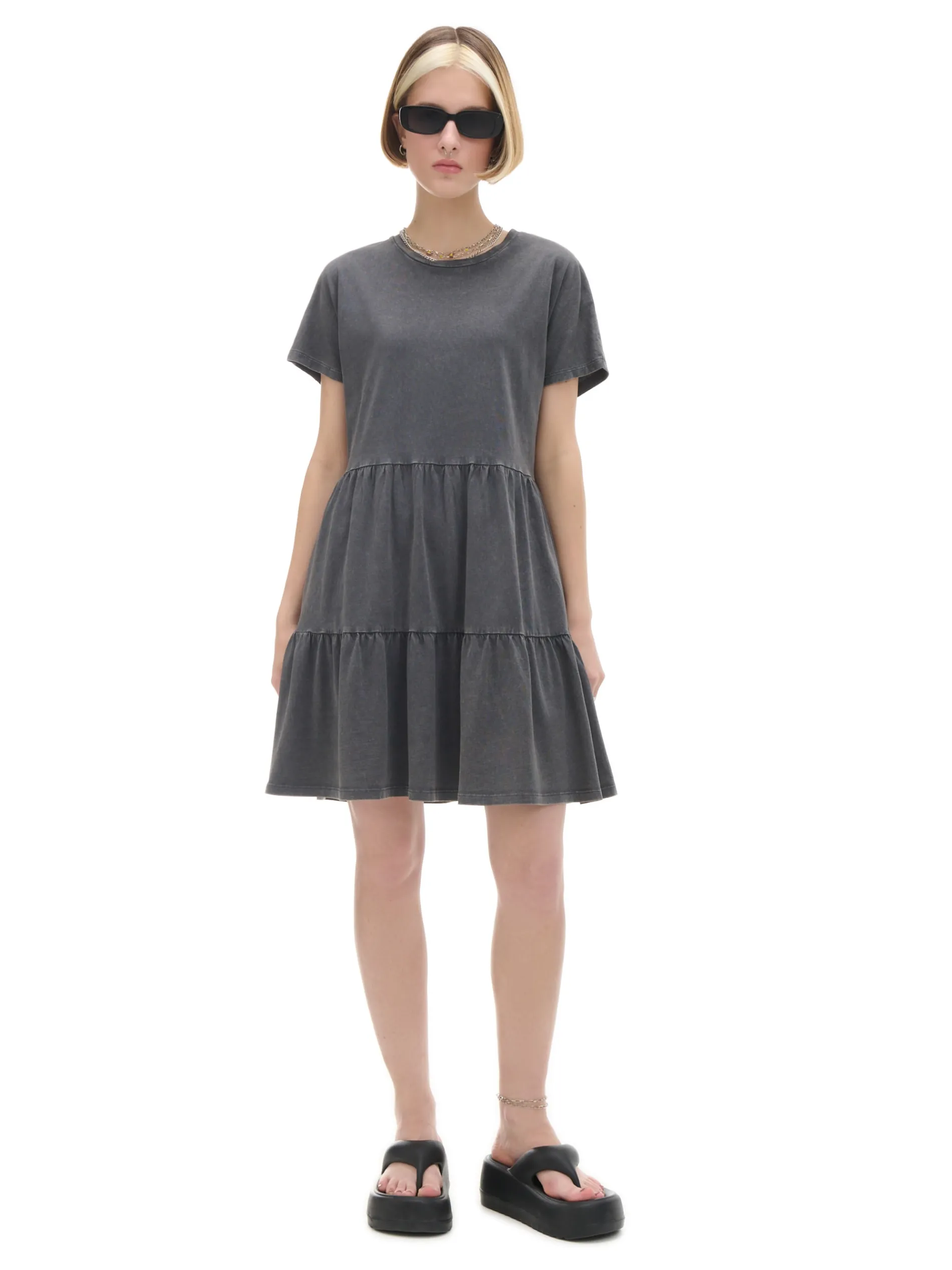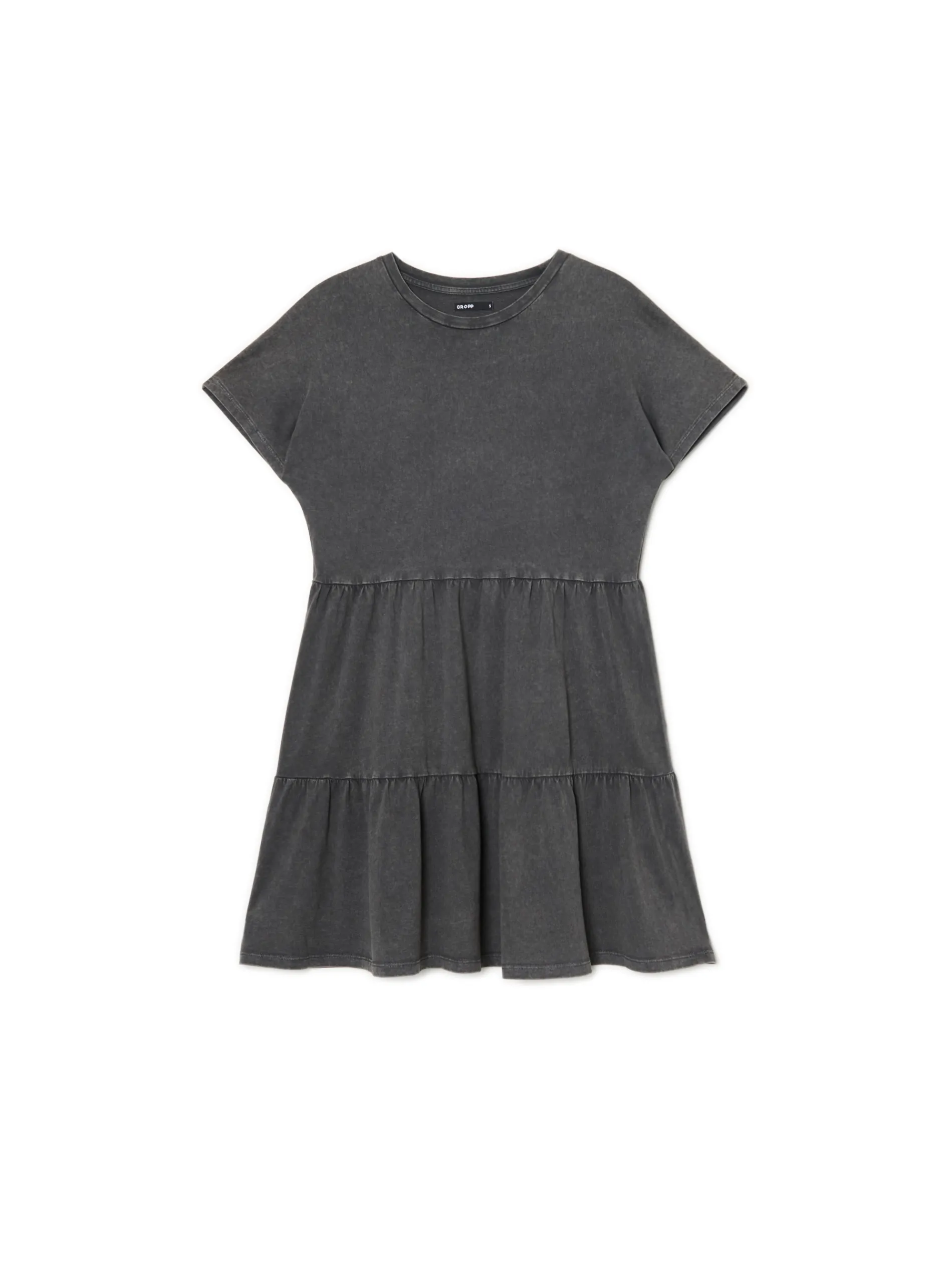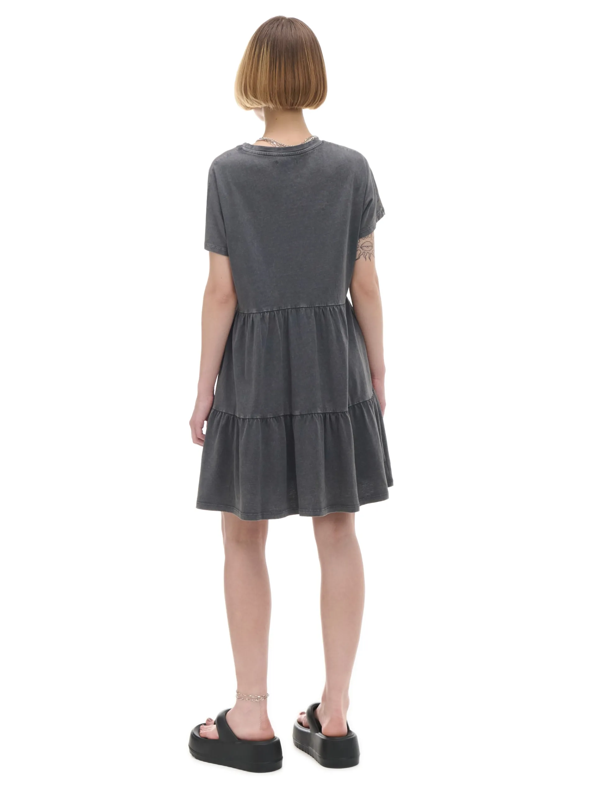 Bawełniana sukienka mini w szarym odcieniu z ozdobnymi falbanami i marszczeniami. Fituje z każdym rodzajem obuwia! 100% bawełny długość mini proste, krótkie rękawy efekt sprania na całości ozdobne falbany i marszczenia