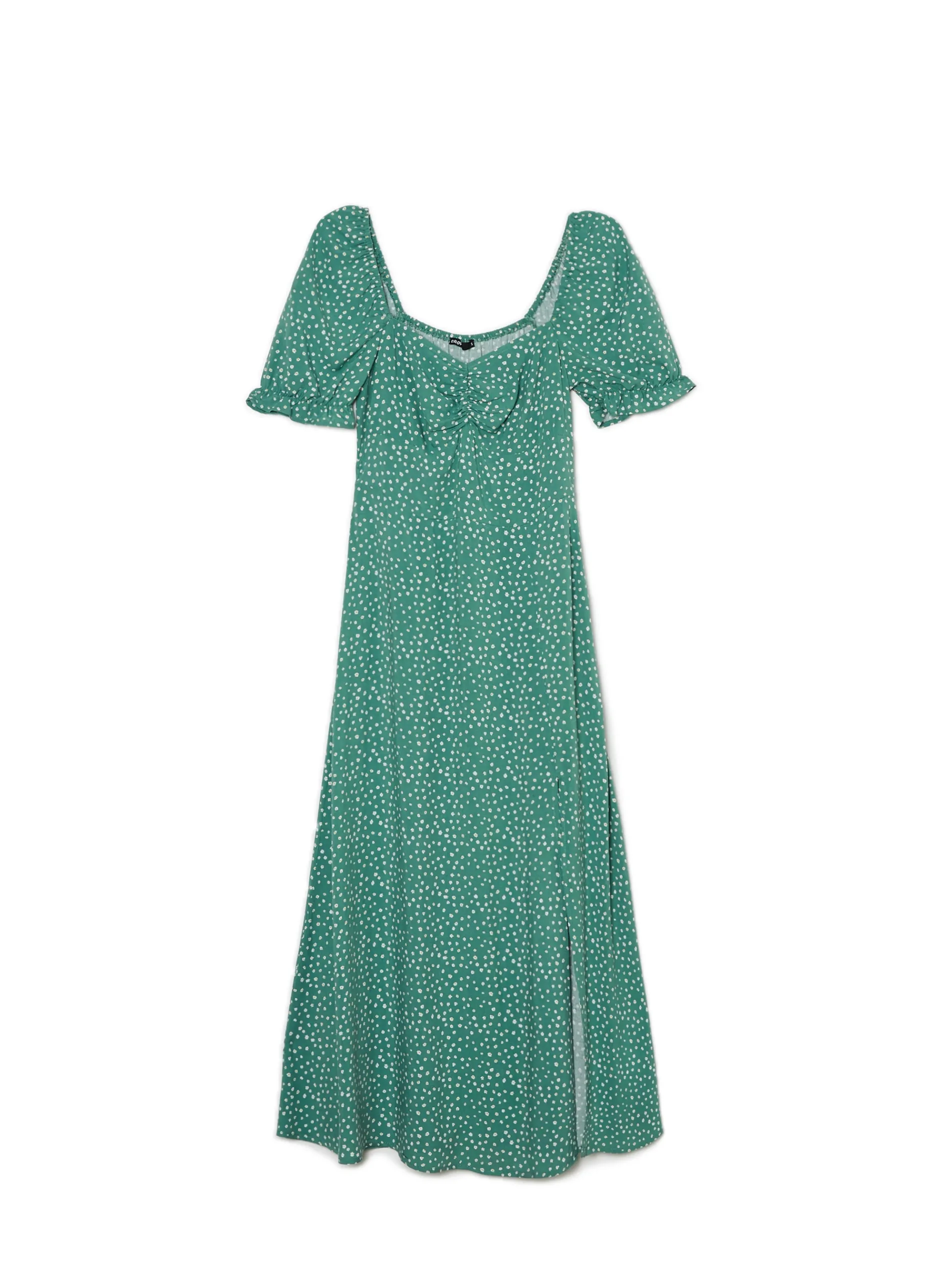 Delikatna damska zielona sukienka z kwiatowym wzorem, idealna na letnie dni. 100% wiskozy długość midi rozcięcie z boku dekoracyjne marszczenie pod biustem krótkie, bufiaste rękawy zakończone gumką Wzrost modelki: 168 cm