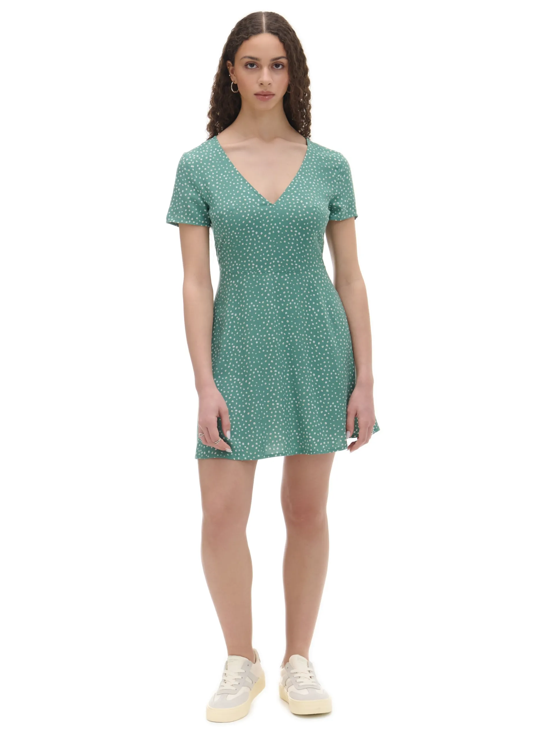 Klasyczna damska zielona sukienka z motywem kwiatowym wykonana z lekkiej, zwiewnej tkaniny będzie stanowiła podstawę wszystkich Twoich stylizacji. wykonana z delikatnej, zwiewnej tkaniny luźne, krótkie rękawy dekolt w kształcie litery V odcięta talia z naturalnie puszczonym materiałem Wzrost modelki: 170 cm