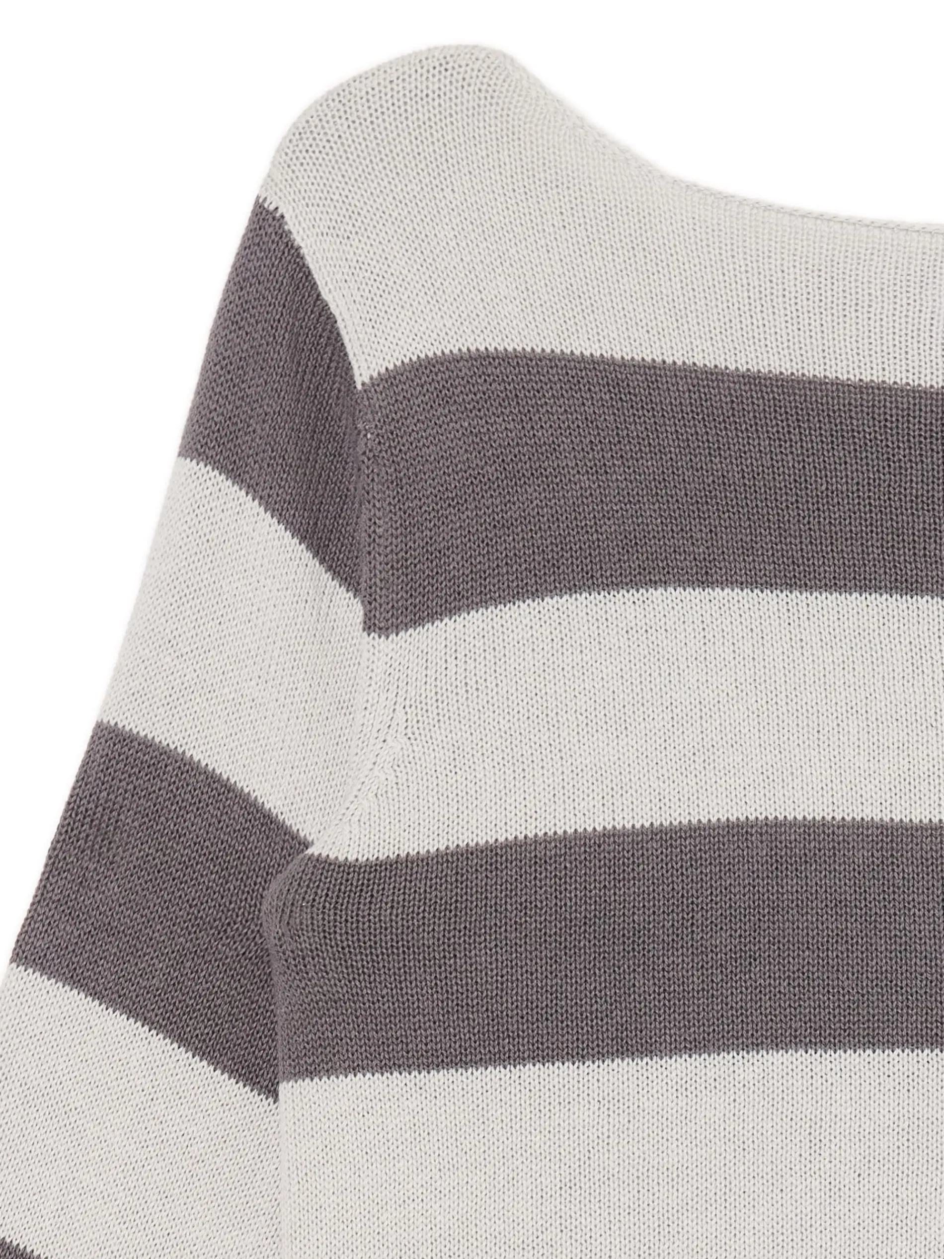 Damski sweter uszyty z miękkiej dzianiny ze wzorem w paski. Przyjemny i wygodny model, sprawdź sama! 100% bawełny regularny krój dekolt w łódkę długie, swobodne rękawy dekoracyjne wykończenie dołu i rękawów wzór w paski Wzrost modelki: 172 cm
