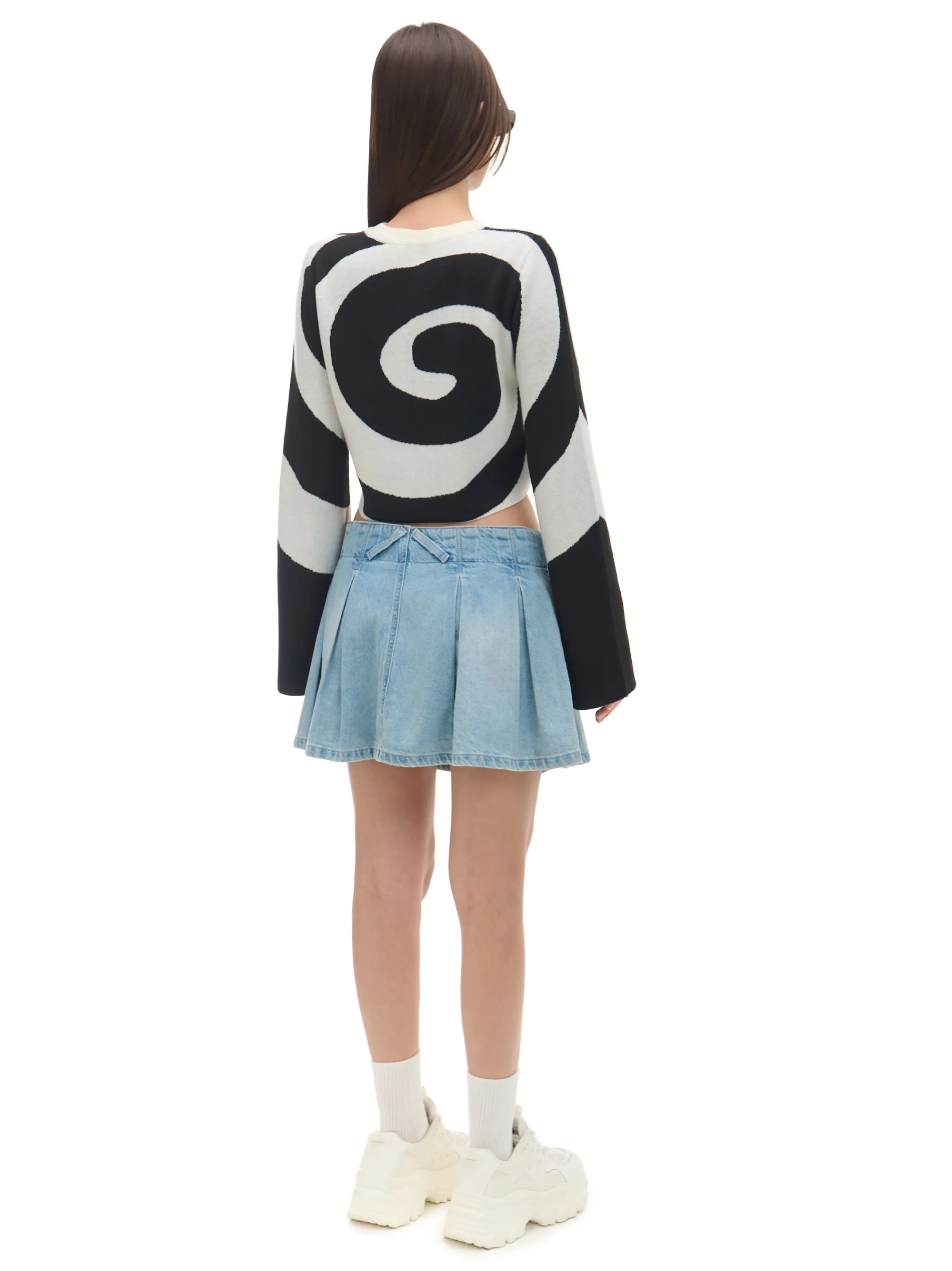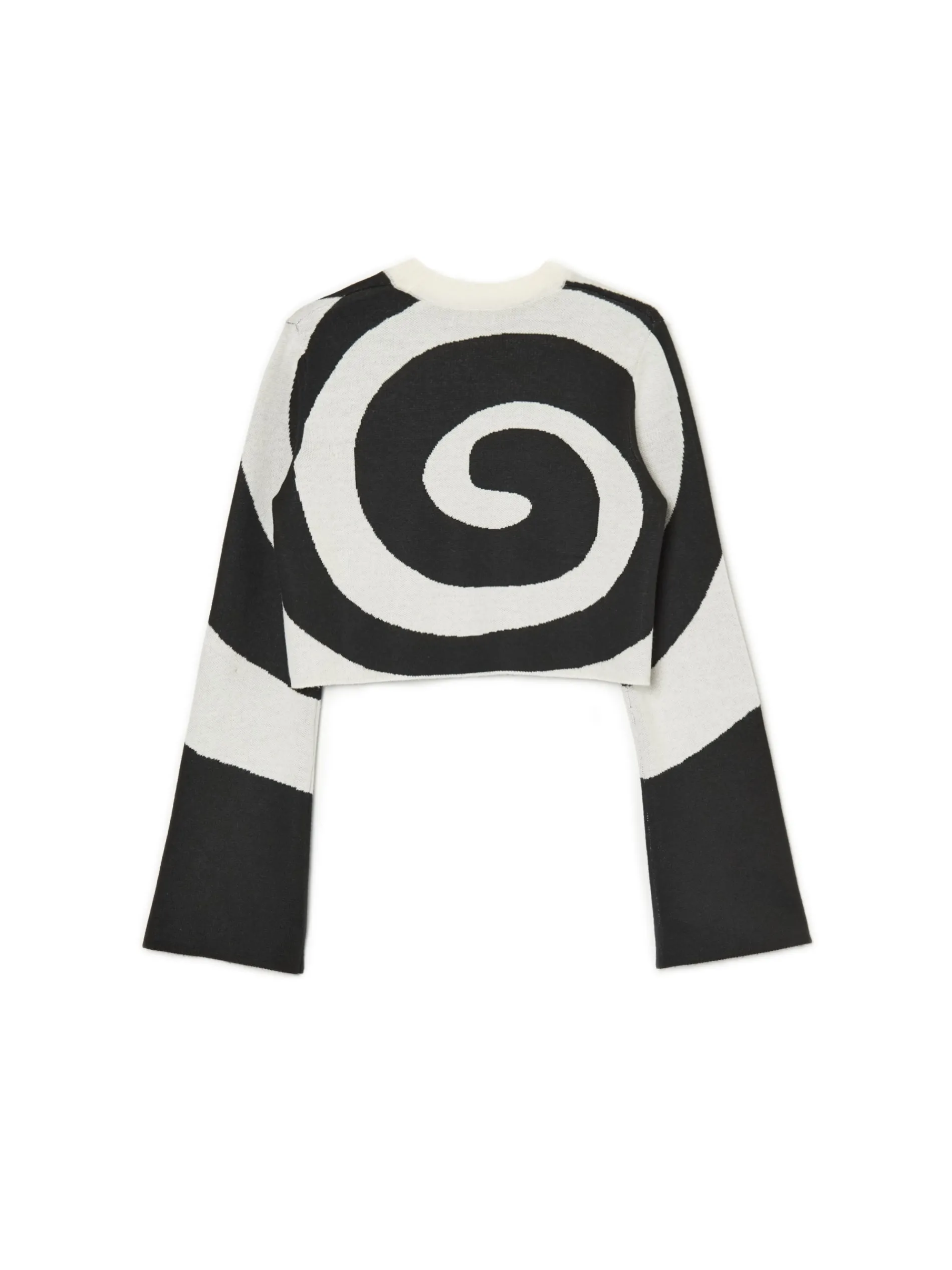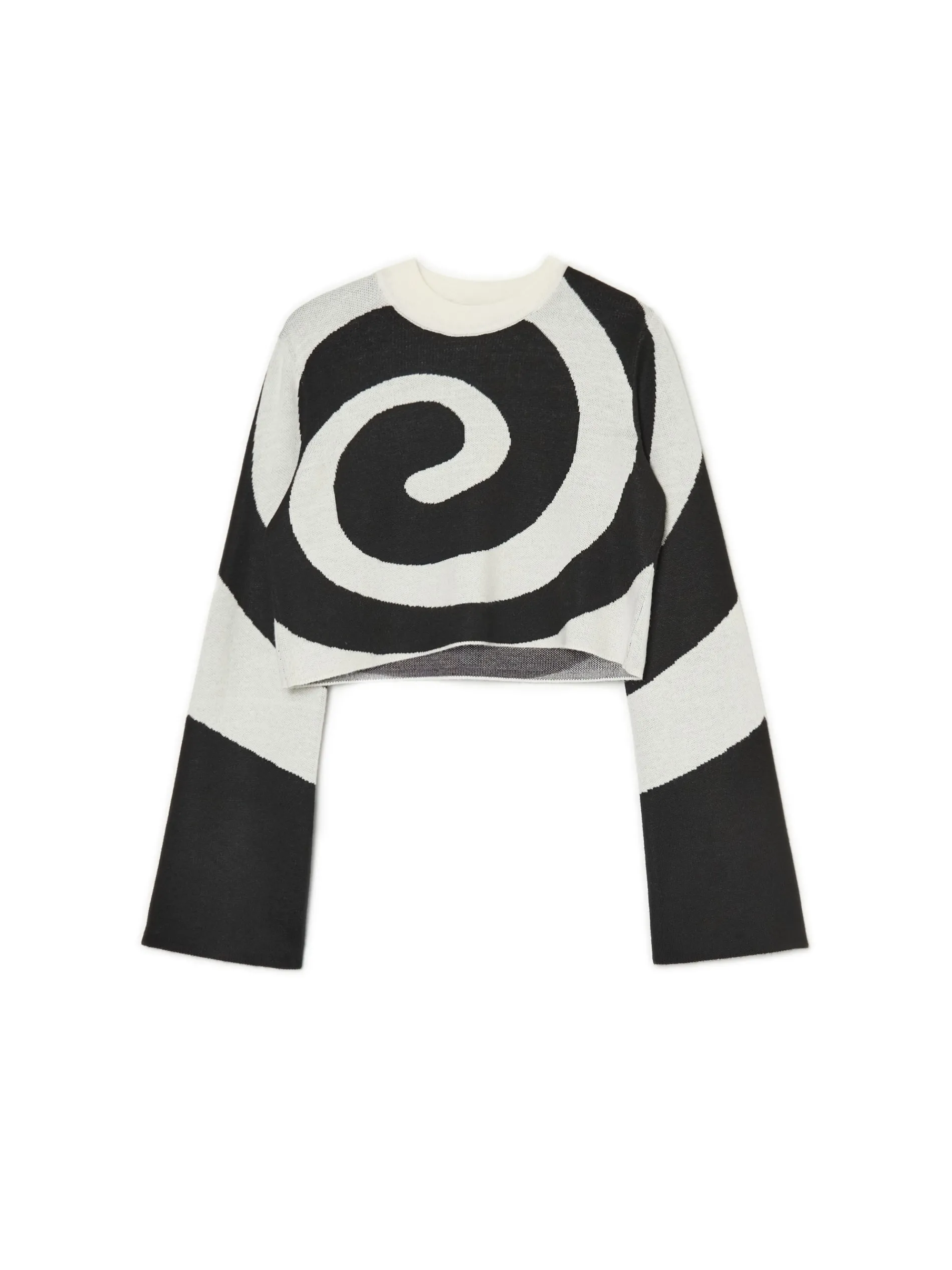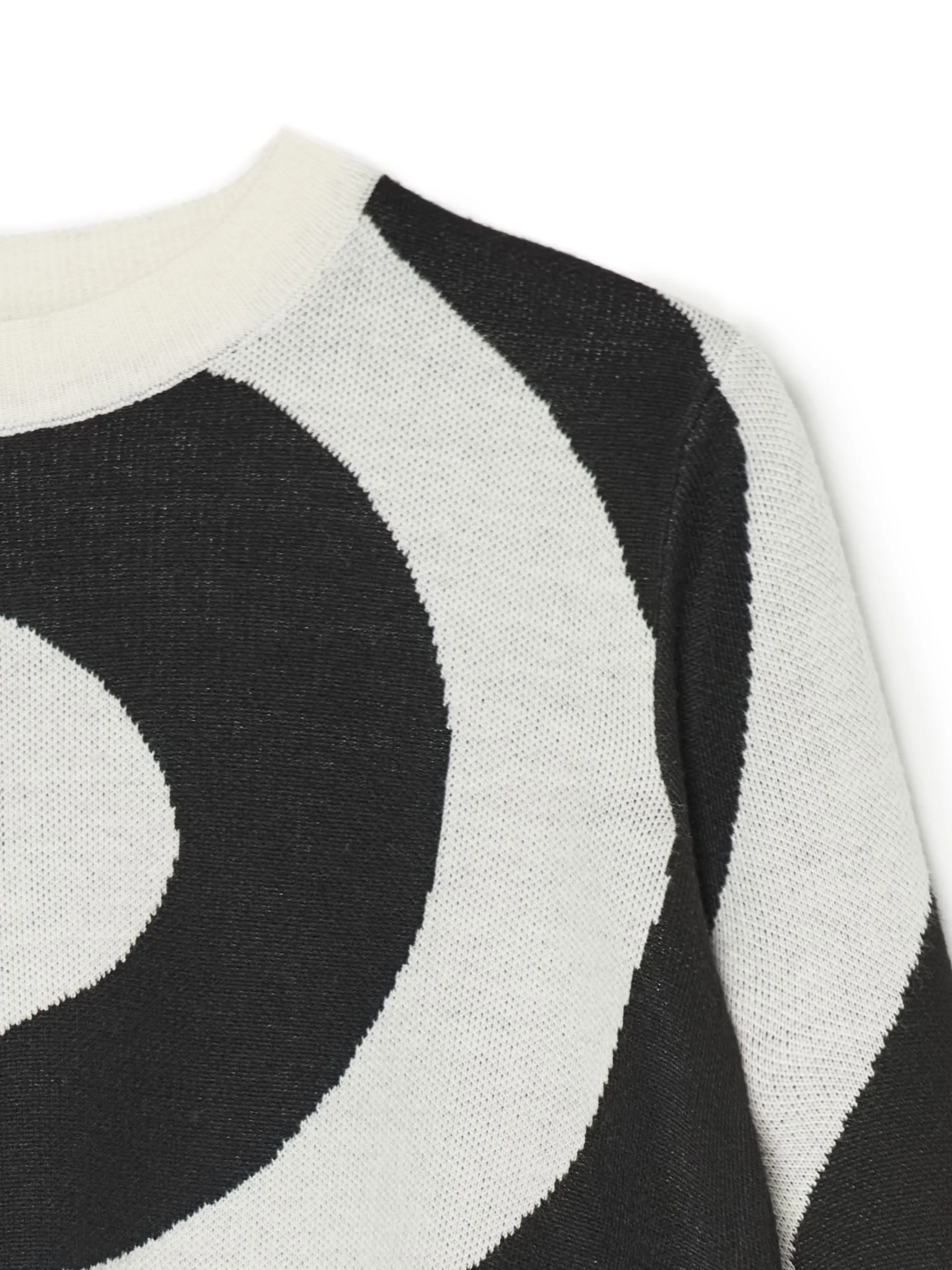 Damski sweter o krótszym kroju, uszyty z żakardowej dzianiny. Szerokie rękawy, na całości biało-czarny motyw. Sweter dostępny w innej wersji kolorystycznej. Rozmiar ubrania: S Wzrost modelki: 168 cm