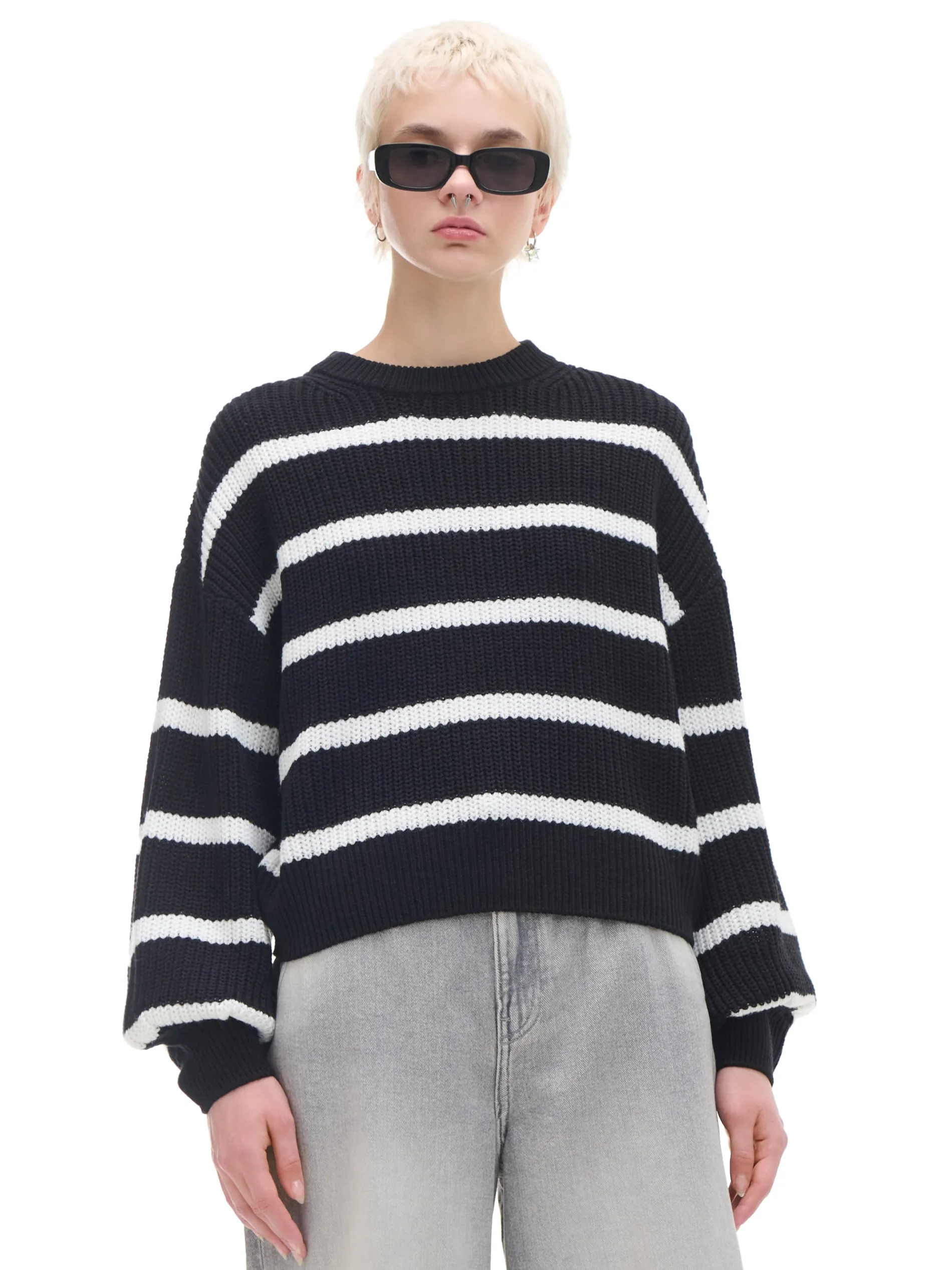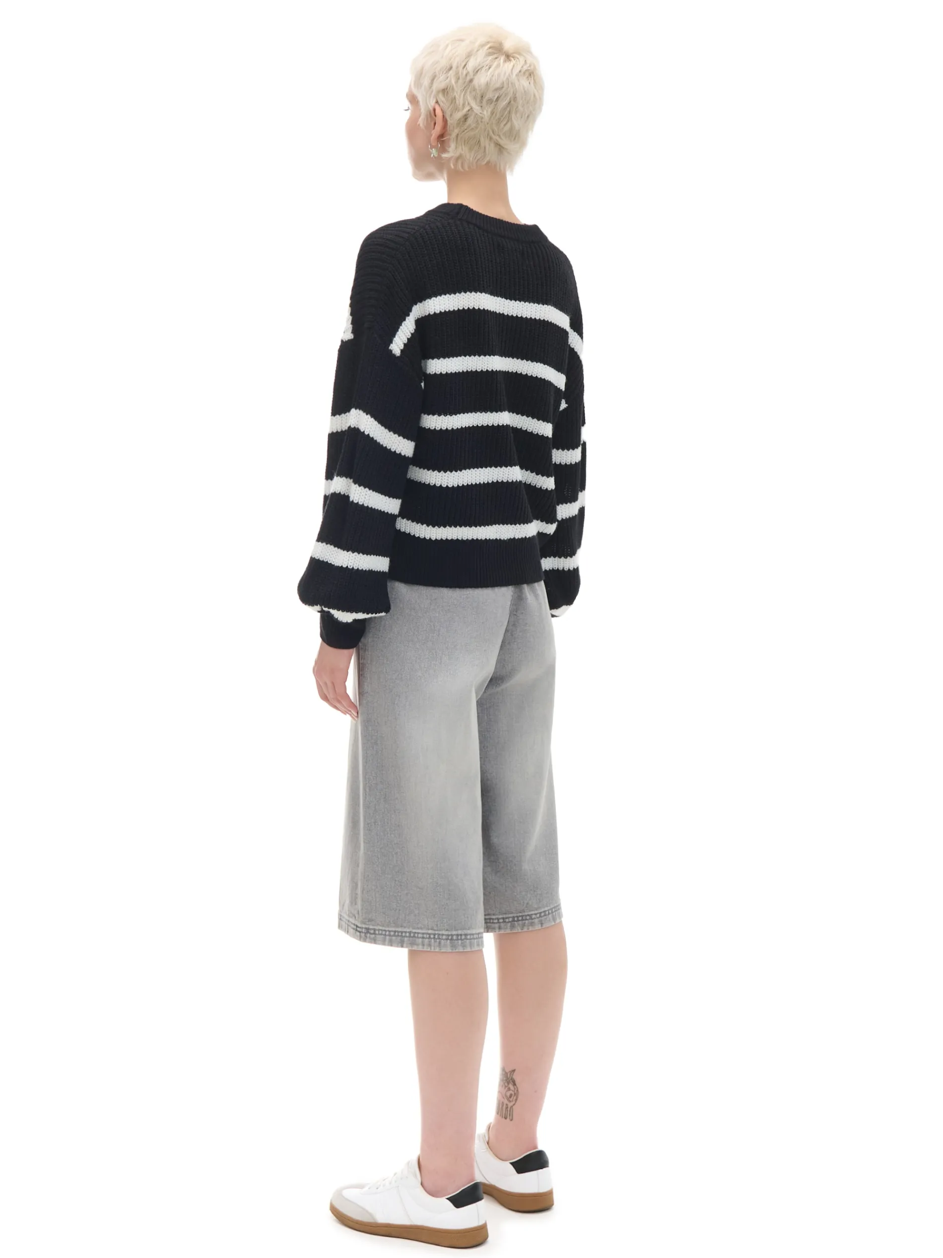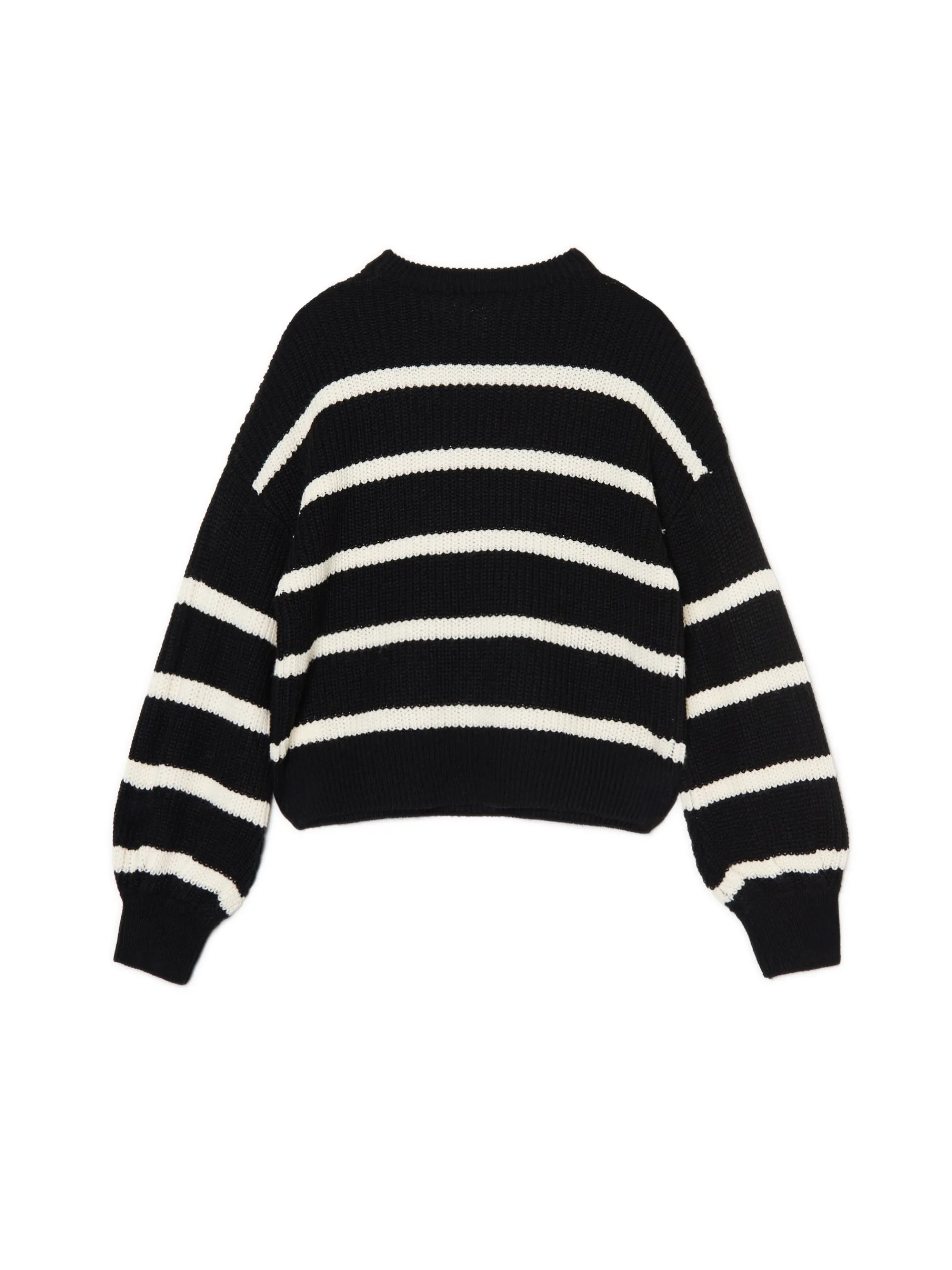 Czarno-biały sweter damski o regularnym kroju, uszyty z dzianiny. Szerokie rękawy z ozdobnym wykończeniem. Dostępne inne warianty kolorystyczne.