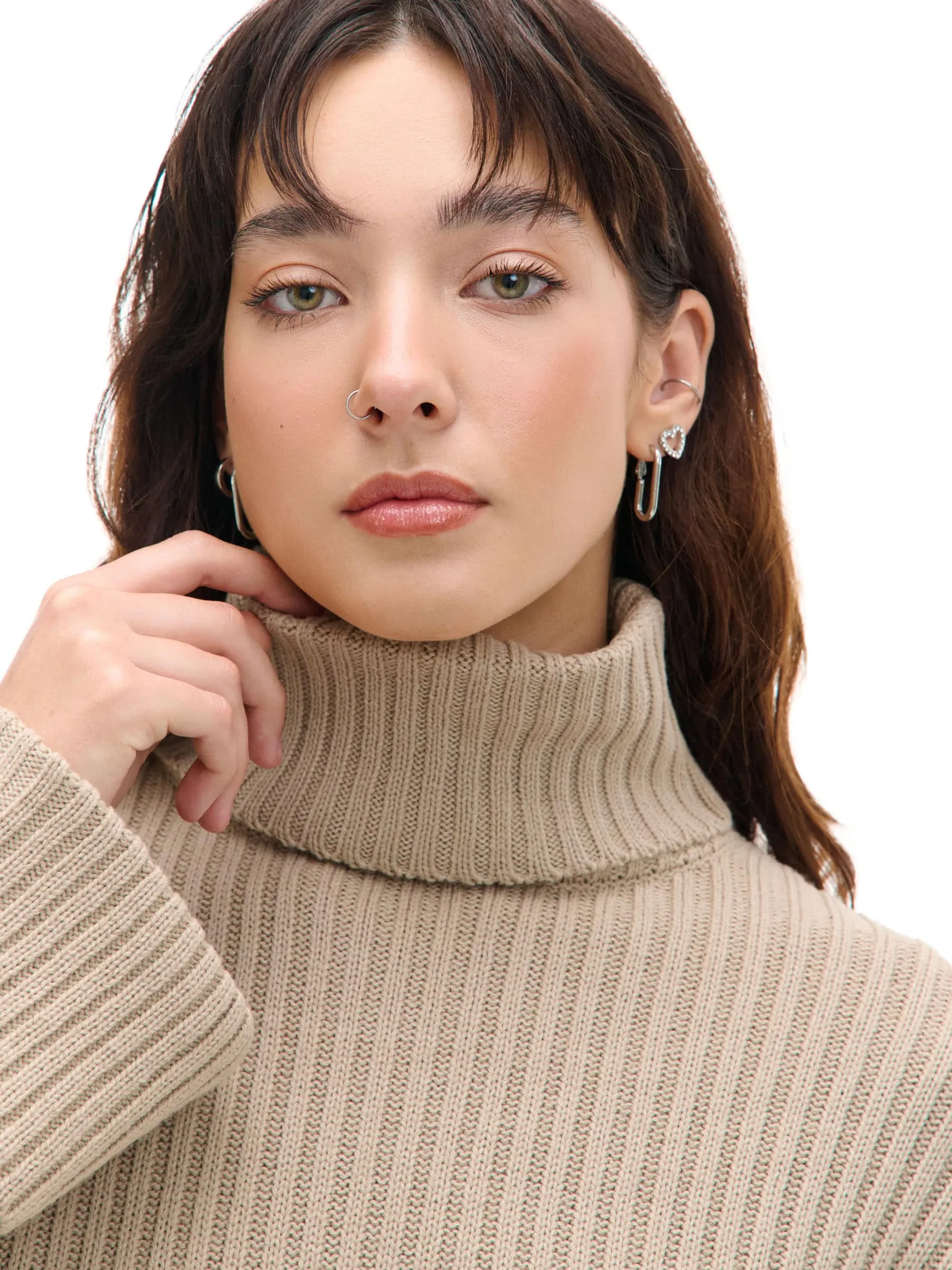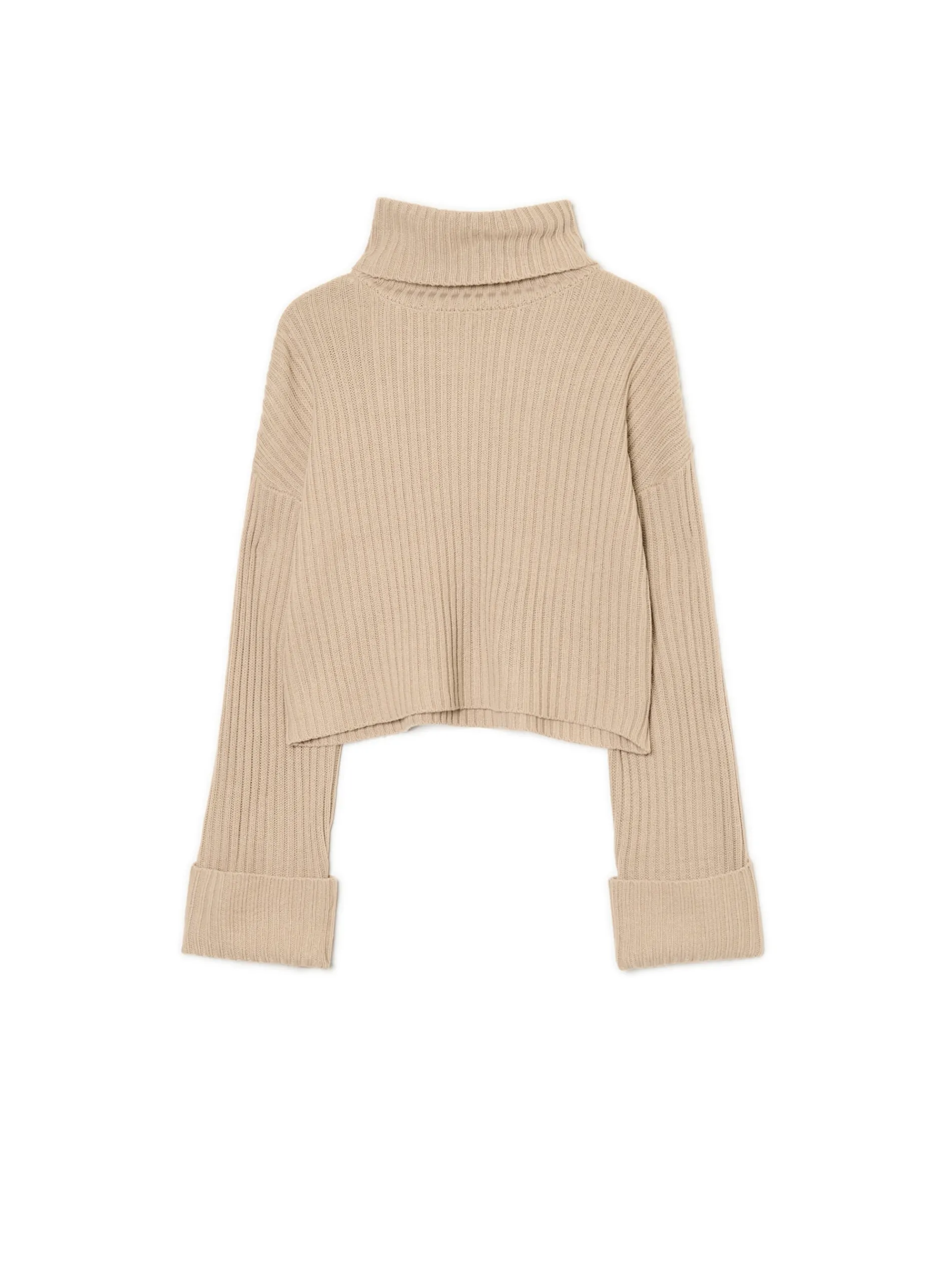 Stylowy cozy sweter idealny na jesienne spacery z bestie. Prążkowany solidny materiał, wygodny golf i oryginalnie podwinięte mankiety przy rękawach. Must have tego sezonu! dzianinowy sweter o kroju oversize prążkowany materiał oversizowy krój krótki fason zabudowany dekolt z golfem długie, swobodne rękawy z podwiniętym mankietem delikatnie obniżona linia ramion