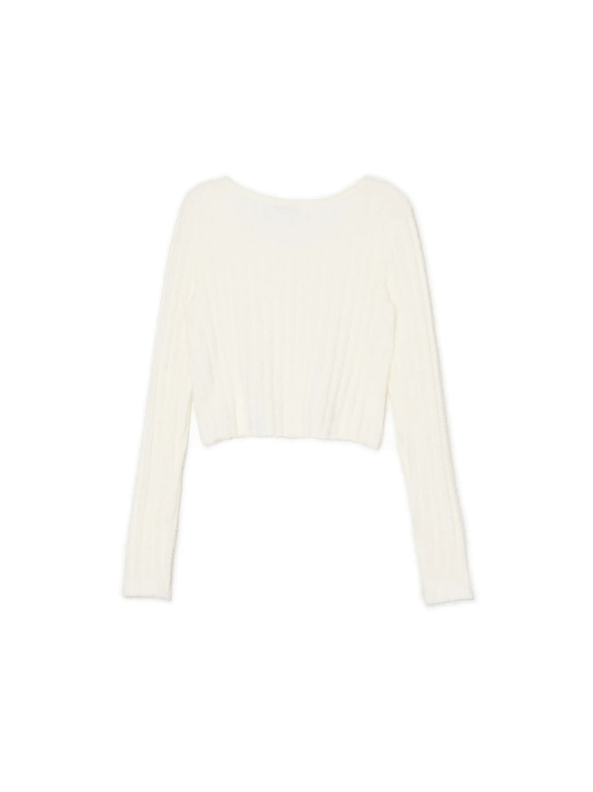 Damski biały sweterek, uszyty z przyjemnej w dotyku mieszanki dzianin. Idealny, jeśli kochasz cozy vibes: strukturalne pionowe prążki podkreślają jego jesienarski charakter. dopasowany krój długie rękawy dekolt typu łódka z przodu zapięcie na guziki