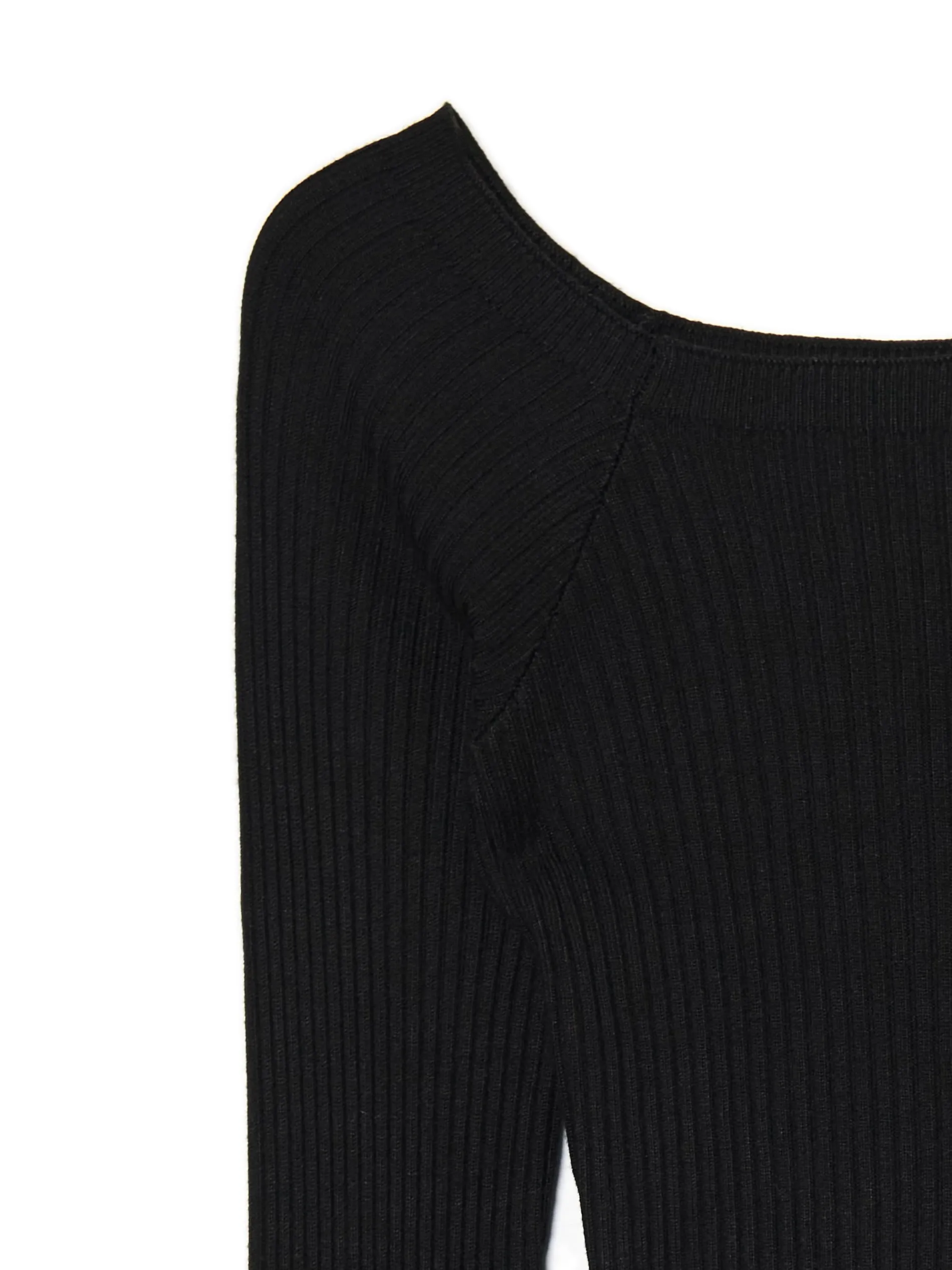 Damski sweter o dopasowanym, krótszym kroju, uszyty z prążkowanej dzianiny o wysokiej zawartości wiskozy. Odkryte ramiona zawsze robią wrażenie! uszyty z elastycznej dzianiny w prążki krótki, dopasowany krój dekolt w łódkę długie, dopasowane rękawy opadające ramiona Wzrost modelki: 177 cm