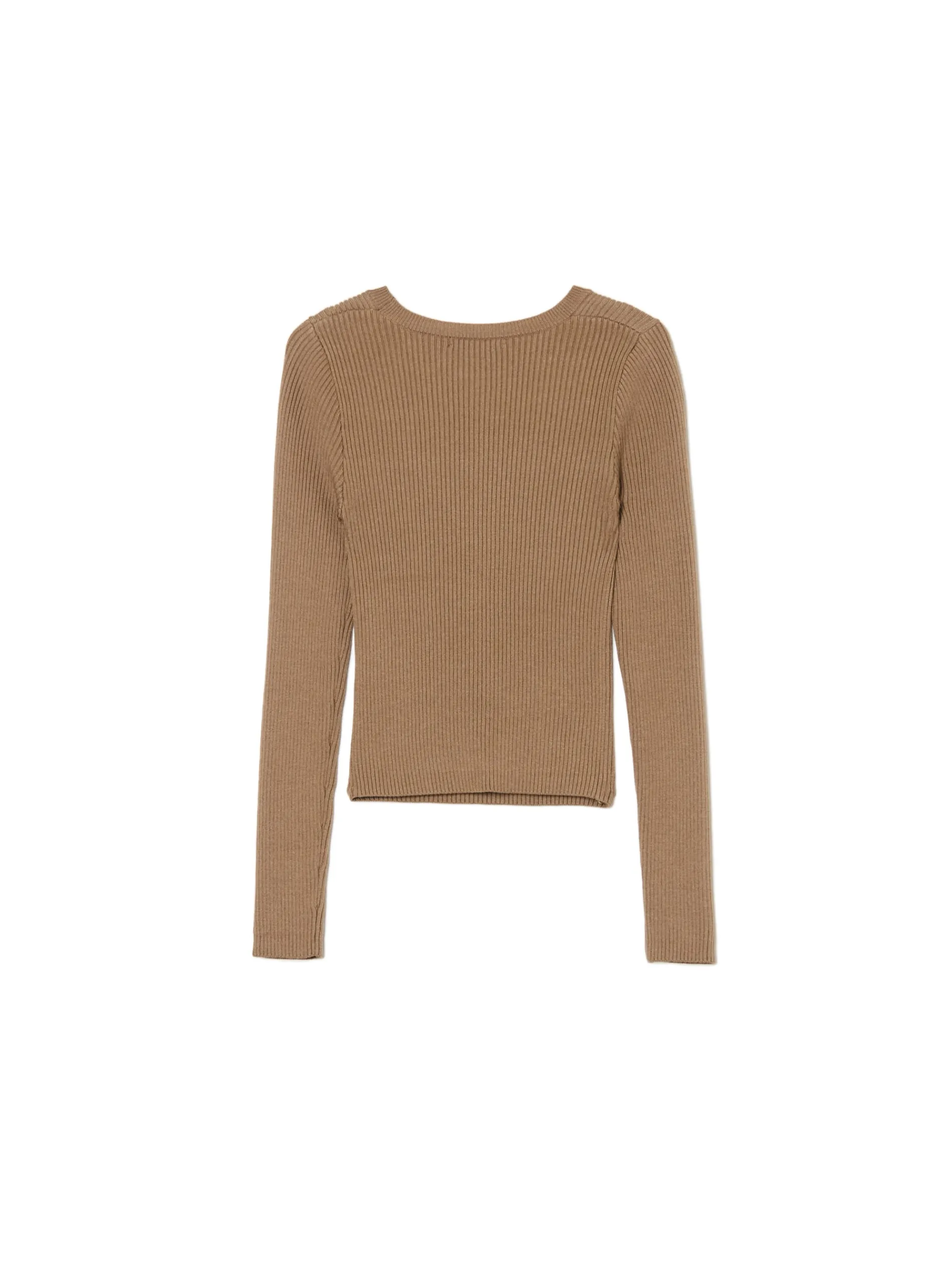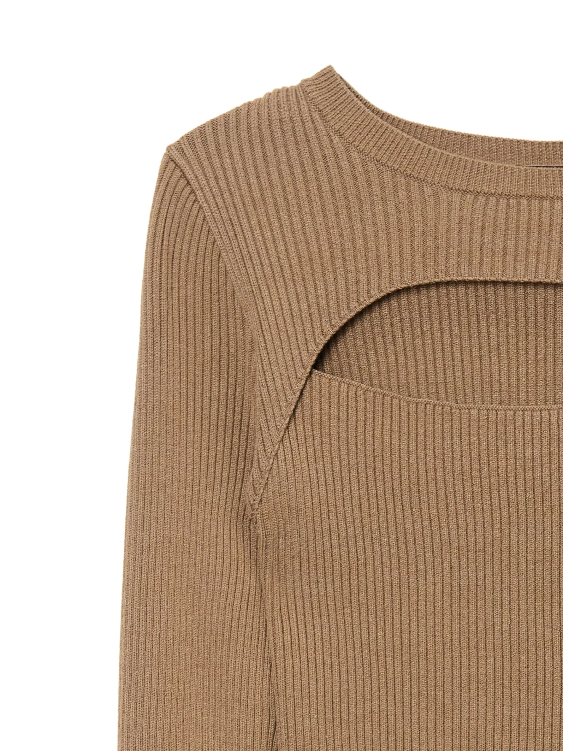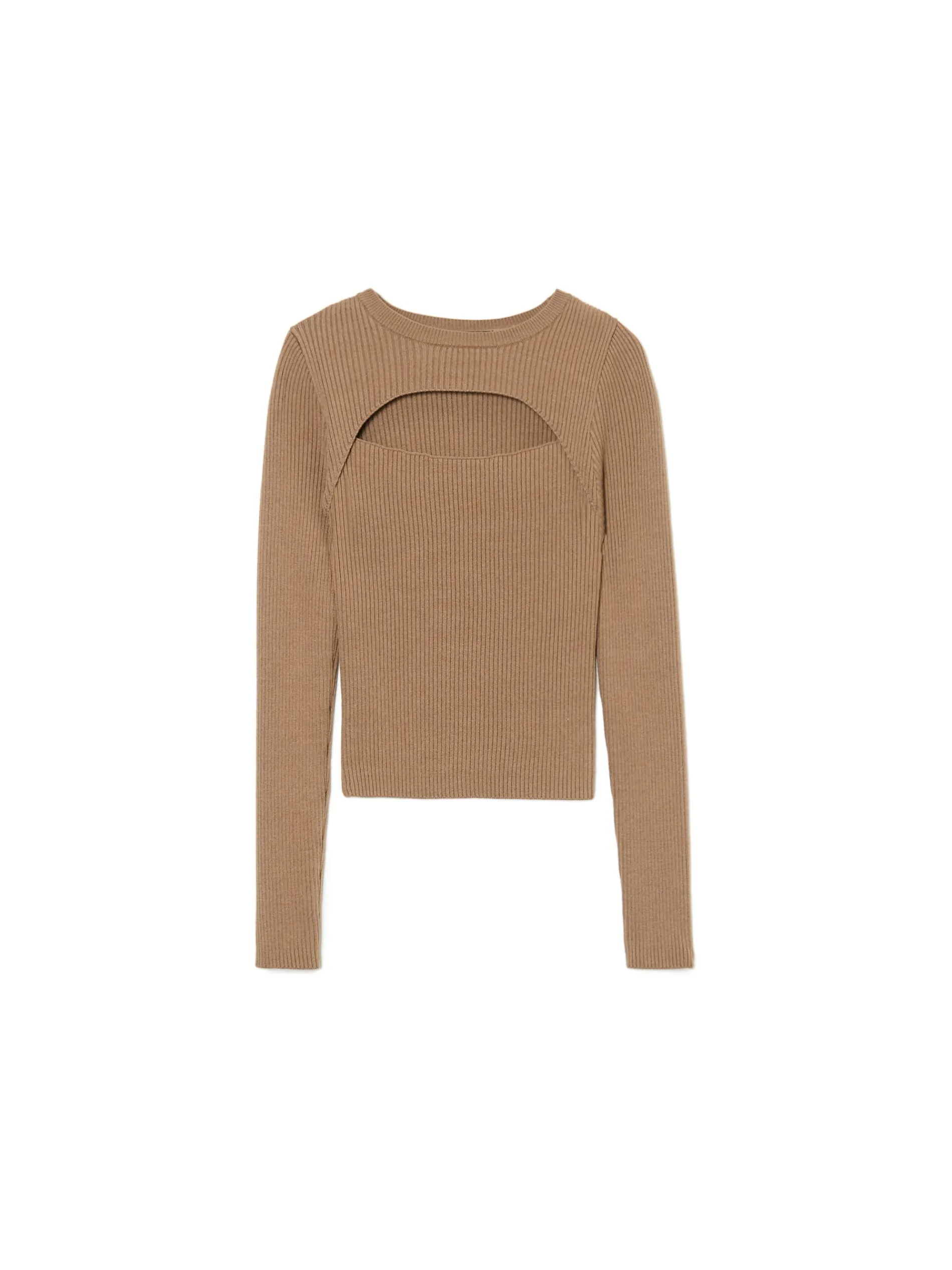 Sweter damski uszyty z mieszanki dzianin z wiskozą ze wzorem w prążki. Sztosowe wycięcie z przodu to nowoczesny design w praktycznym wydaniu. uszyty z prążkowanej dzianiny o wysokiej zawartości wiskozy dopasowany krój podkreślający sylwetkę półokrągły dekolt z lamówką długie, proste rękawy dekoracyjne wycięcie z przodu