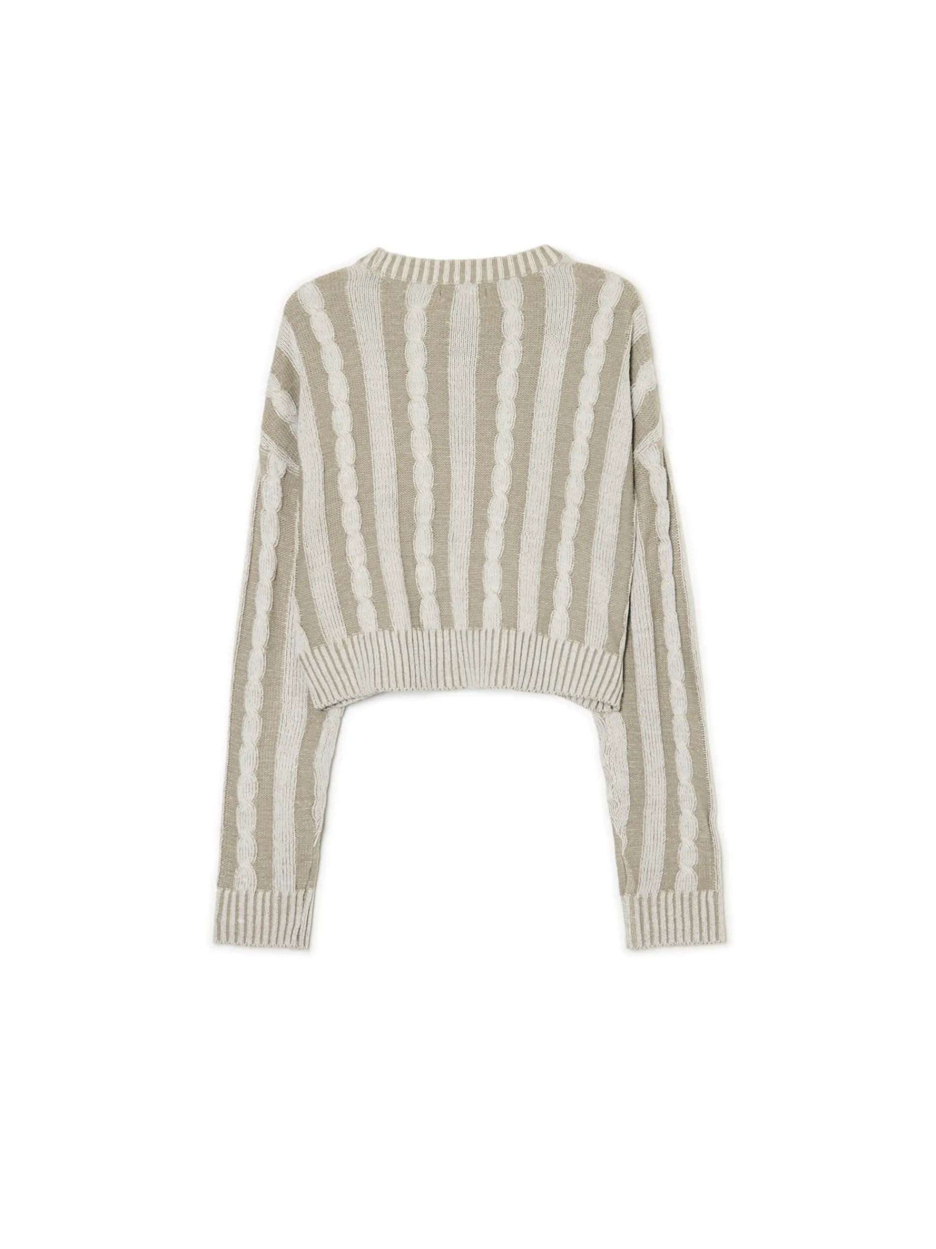 Damski ciepły sweter uszyty z solidnej dzianiny ze strukturalnym wykończeniem. Stonowane kolory, ciekawy splot oraz prążkowane brzegi przy dekolcie, pasie i mankietach nadają mu oldschoolowego charakteru. uszyty z dzianiny z nieszablonową strukturą okrągły dekolt z lamówką długie, swobodne rękawy lekko obniżona linia ramion dół i rękawy wykończone prążkowanym ściągaczem