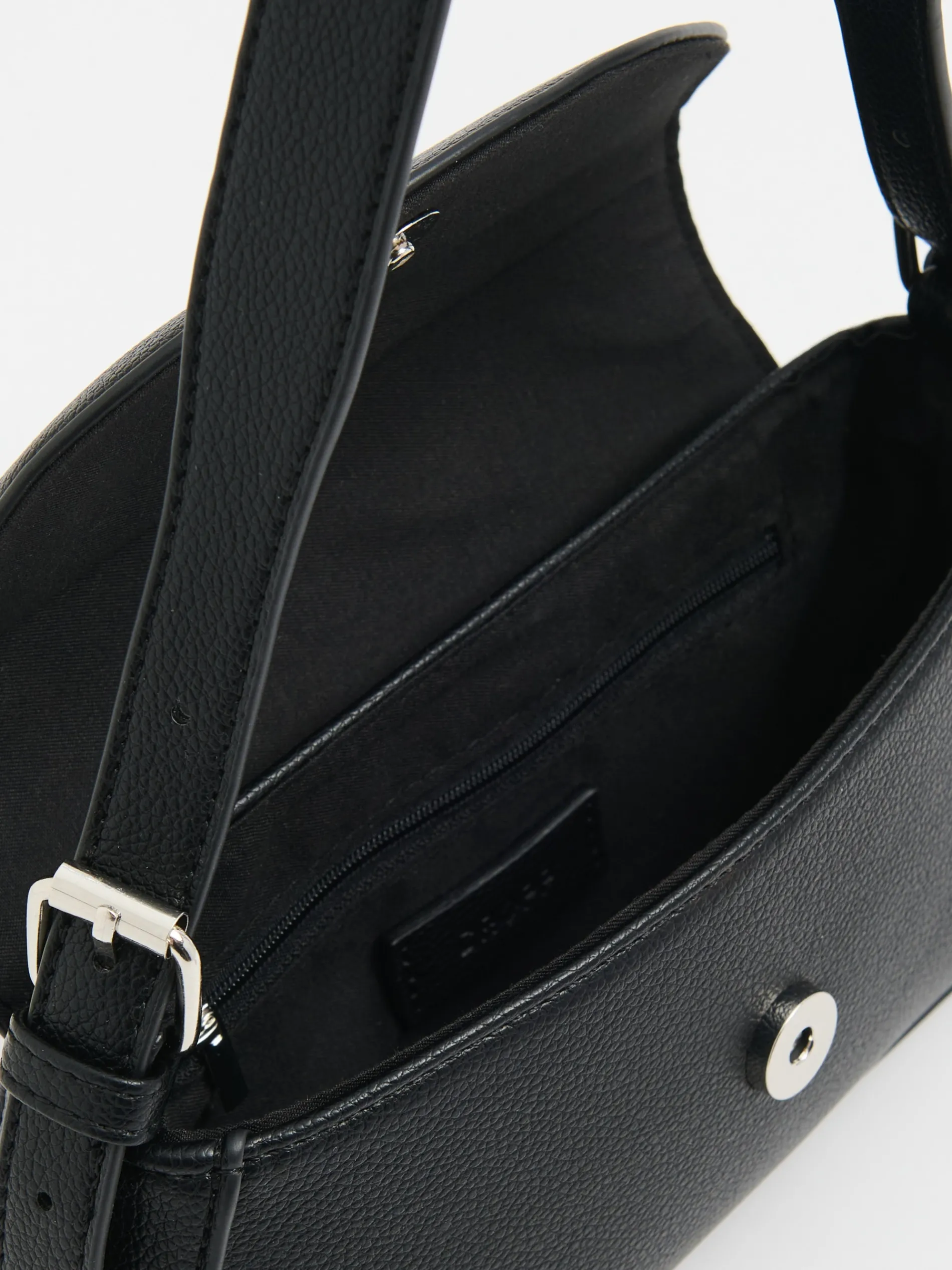 Mała damska torebka wykonana ze sztucznej skóry w kolorze czarnym. Zapinana na magnes, wyposażona w pasek z regulacją długości. Wewnątrz miejsce na najpotrzebniejsze itemki. Idealny dodatek do imprezowych stylizacji. mała torebka z imitacji skóry klapa zamykana na magnes pasek z regulacją długości wewnątrz kieszeń zapinana na zamek naszywka Cropp