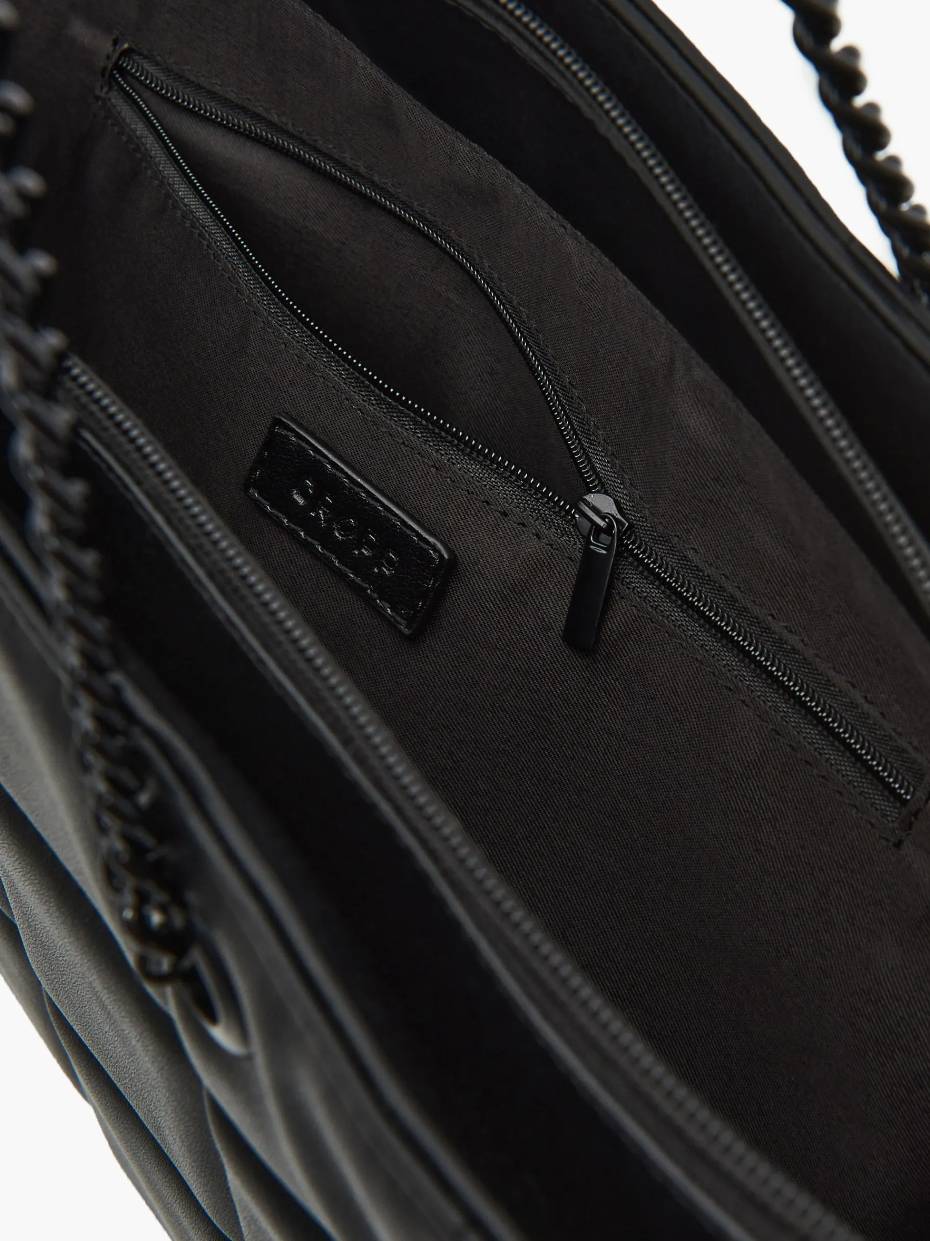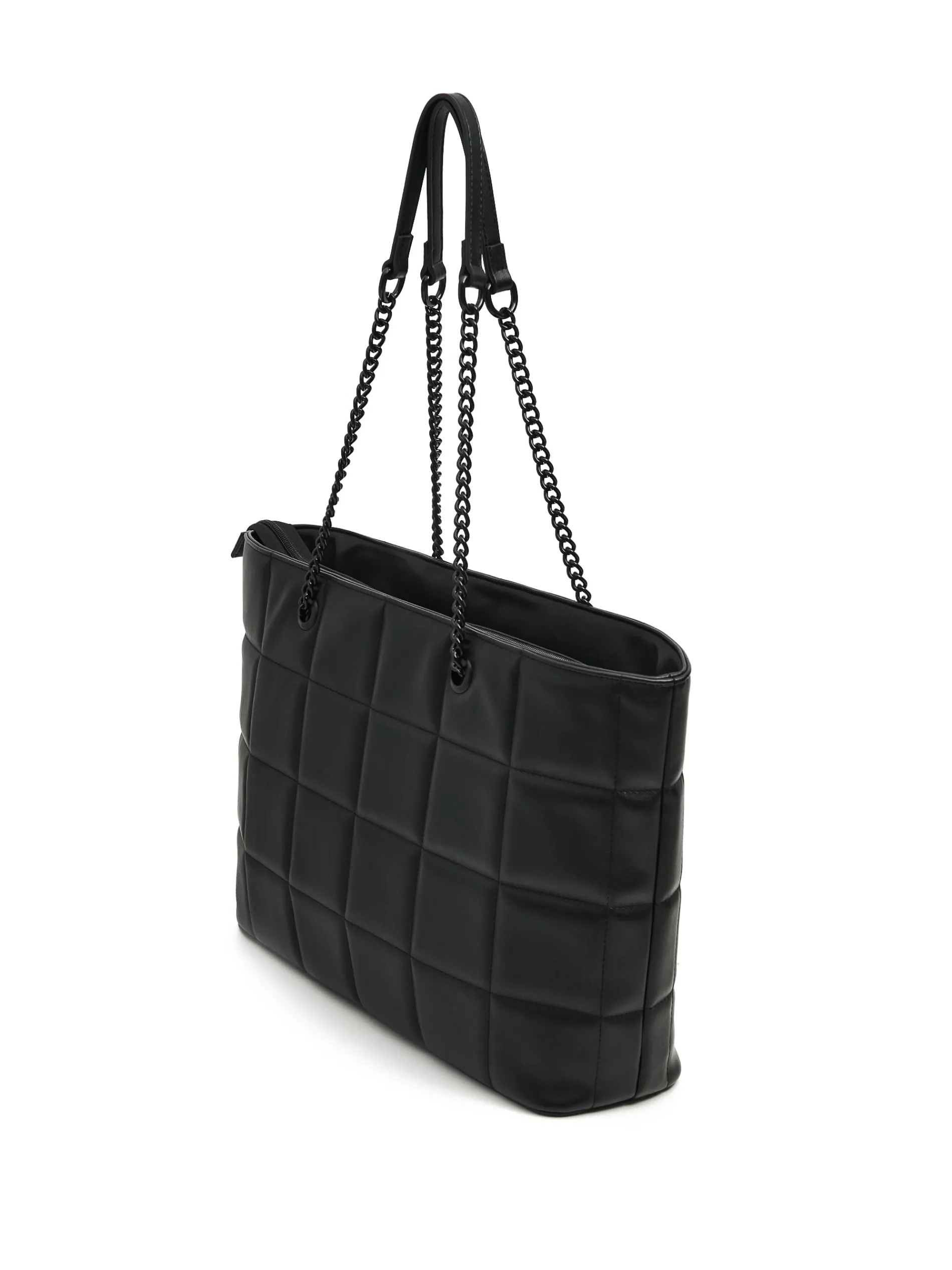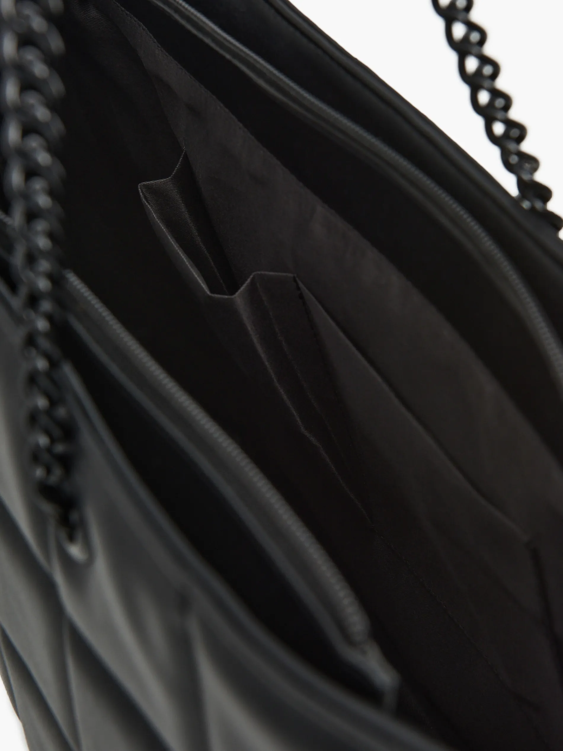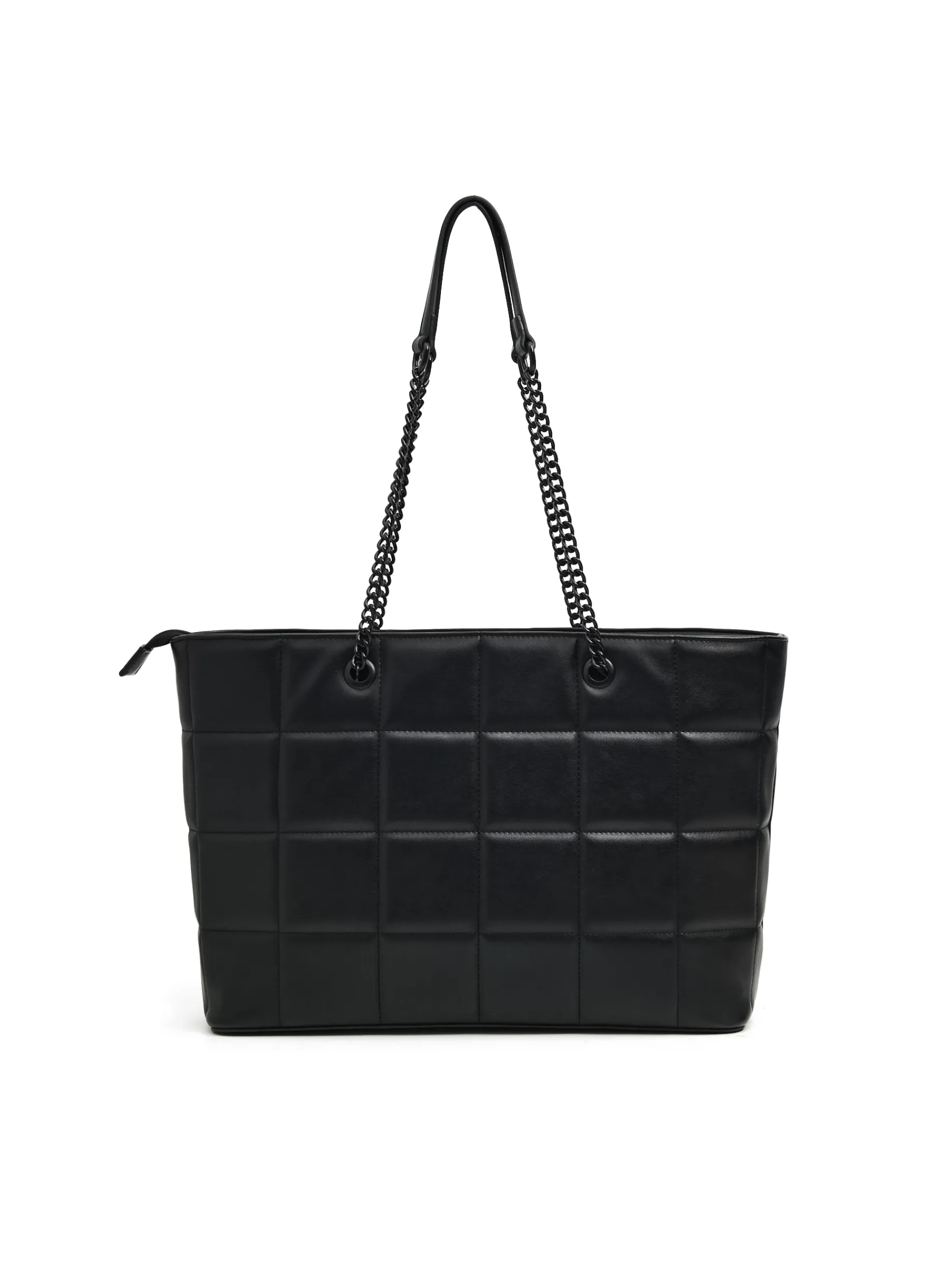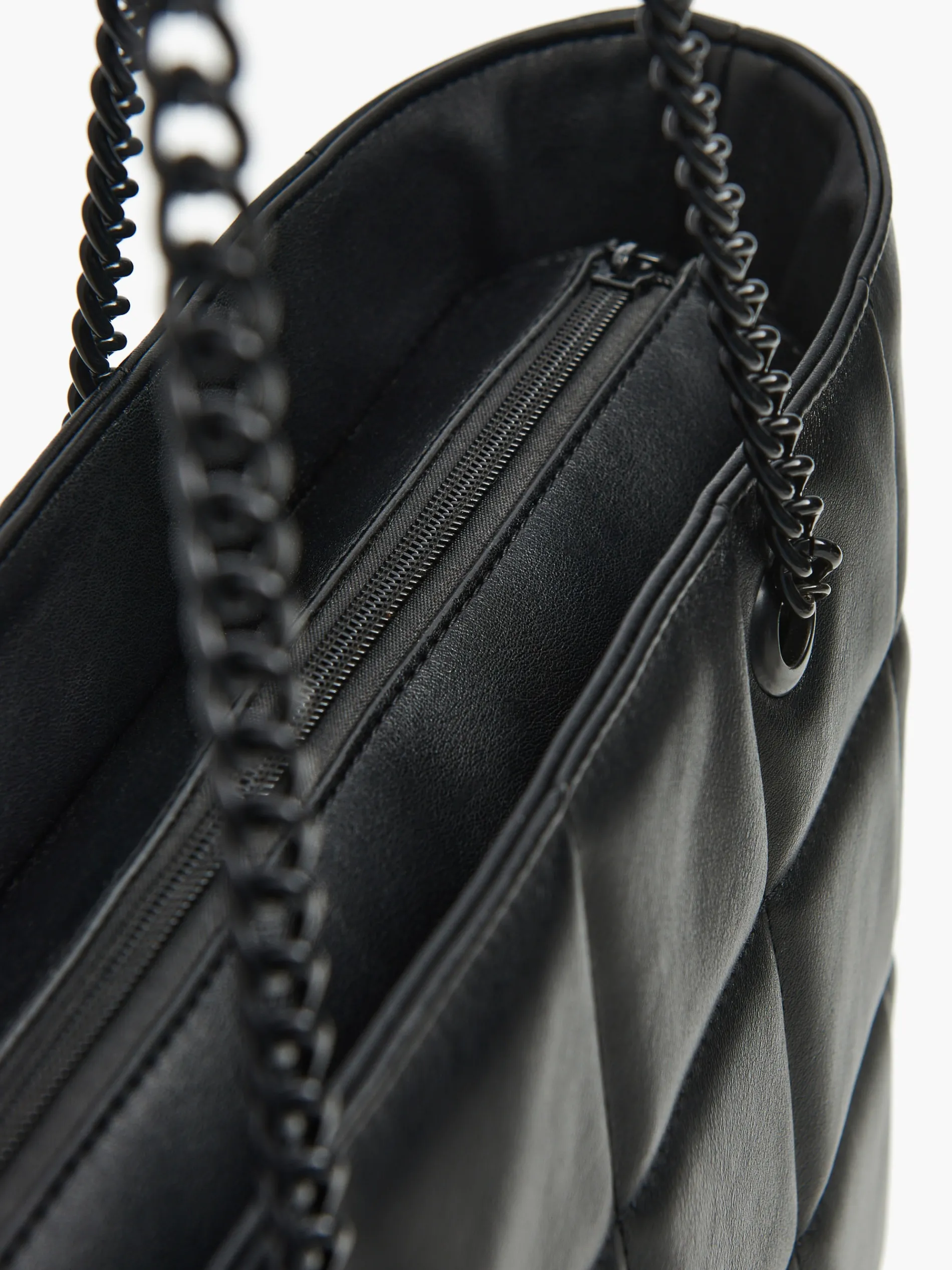 Pikowana damska torebka na łańcuszku, wykonana z czarnej ekoskóry. główna komora zapinana na suwak krótkie rączki, częściowo wykonane z łańcuszków wewnętrzna kieszonka, zapinana na zamek symetryczne pikowanie na całej powierzchni Wymiary produktu: 28 x 48 x 12 cm
