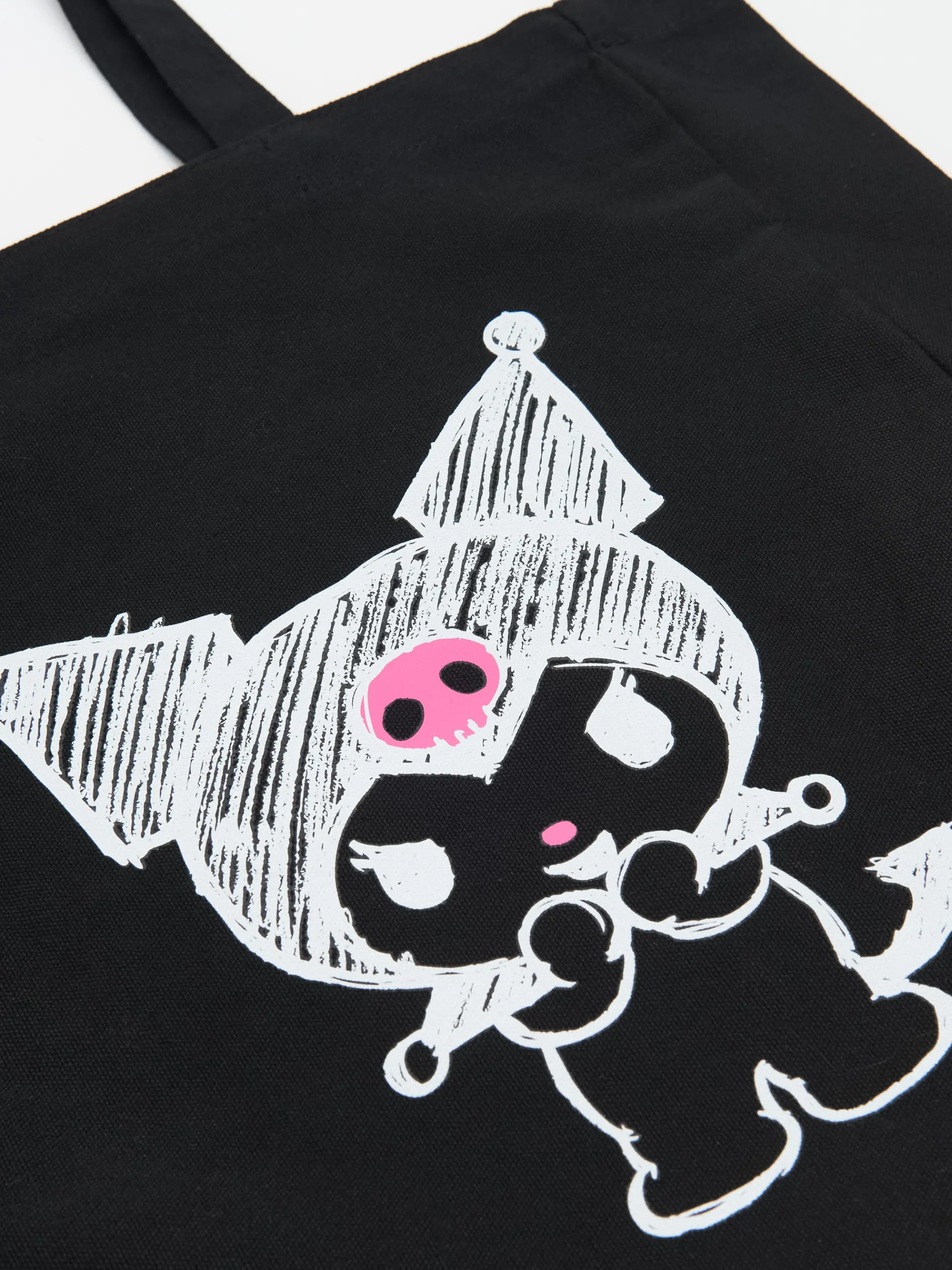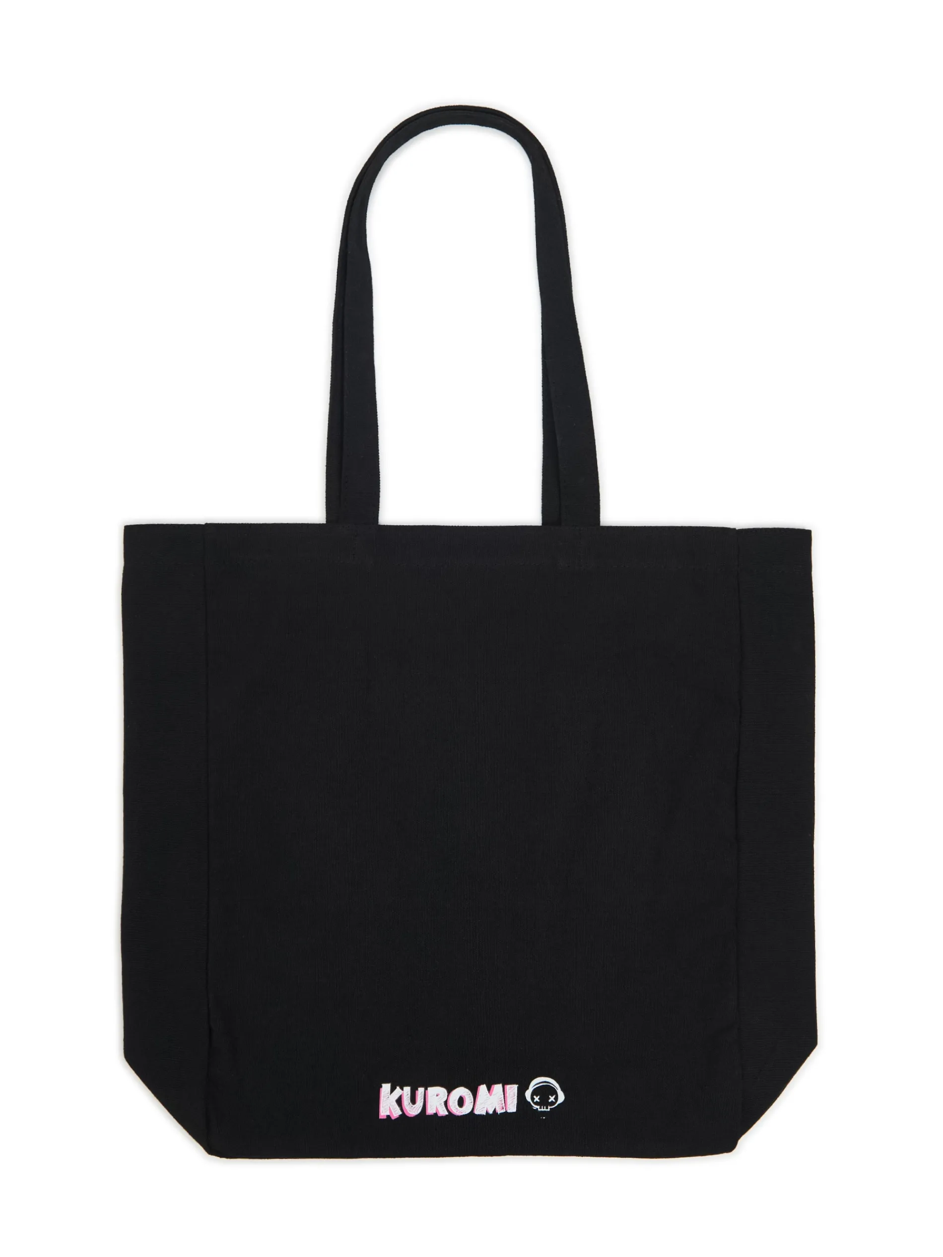 Duża torba typu shopper, uszyta z czarnej tkaniny. Z przodu i tyłu nadruki z motywem Kuromi. Wymiary produktu: 42 x 36 x 12 cm © 2024 SANRIO CO., LTD.