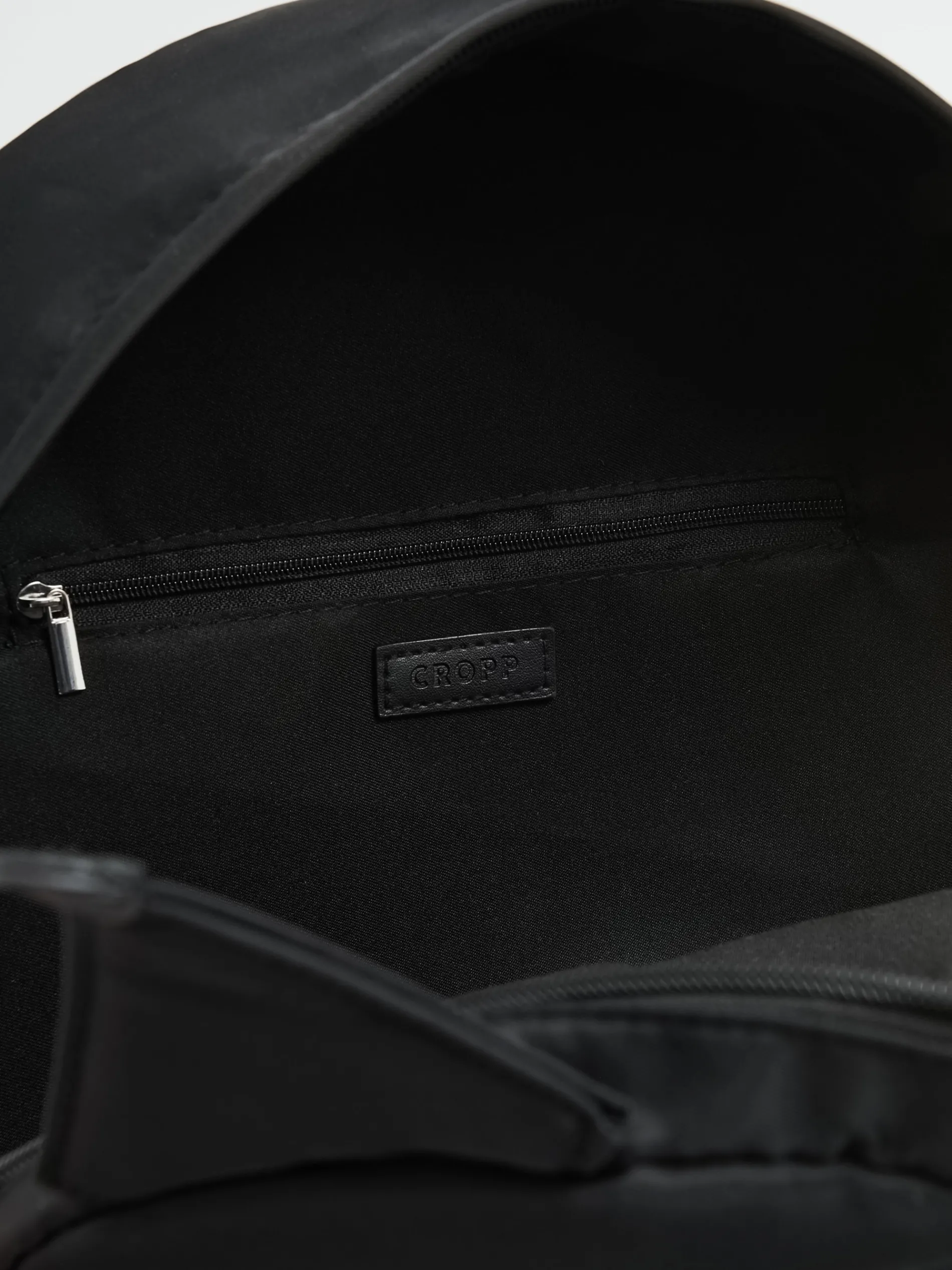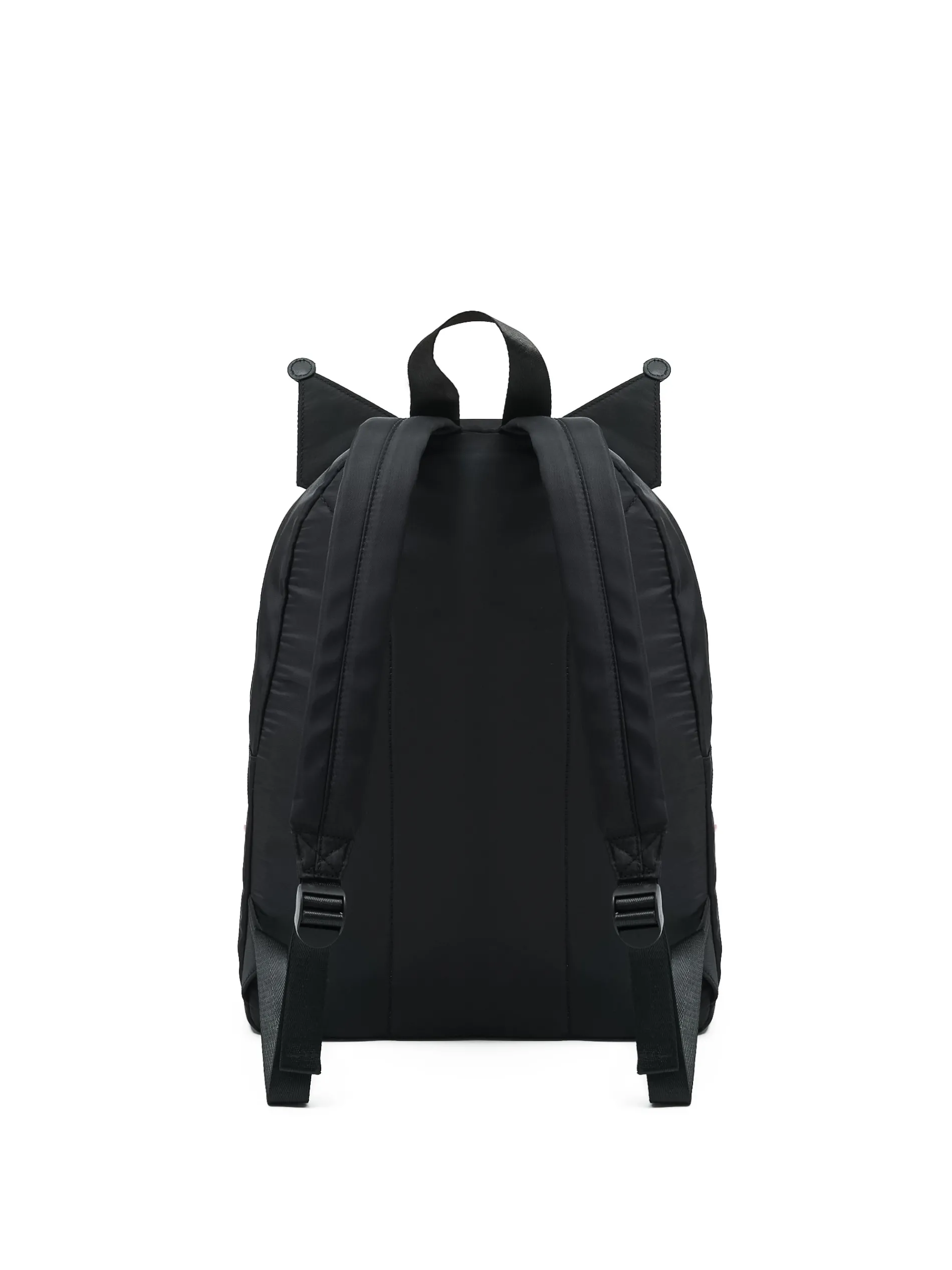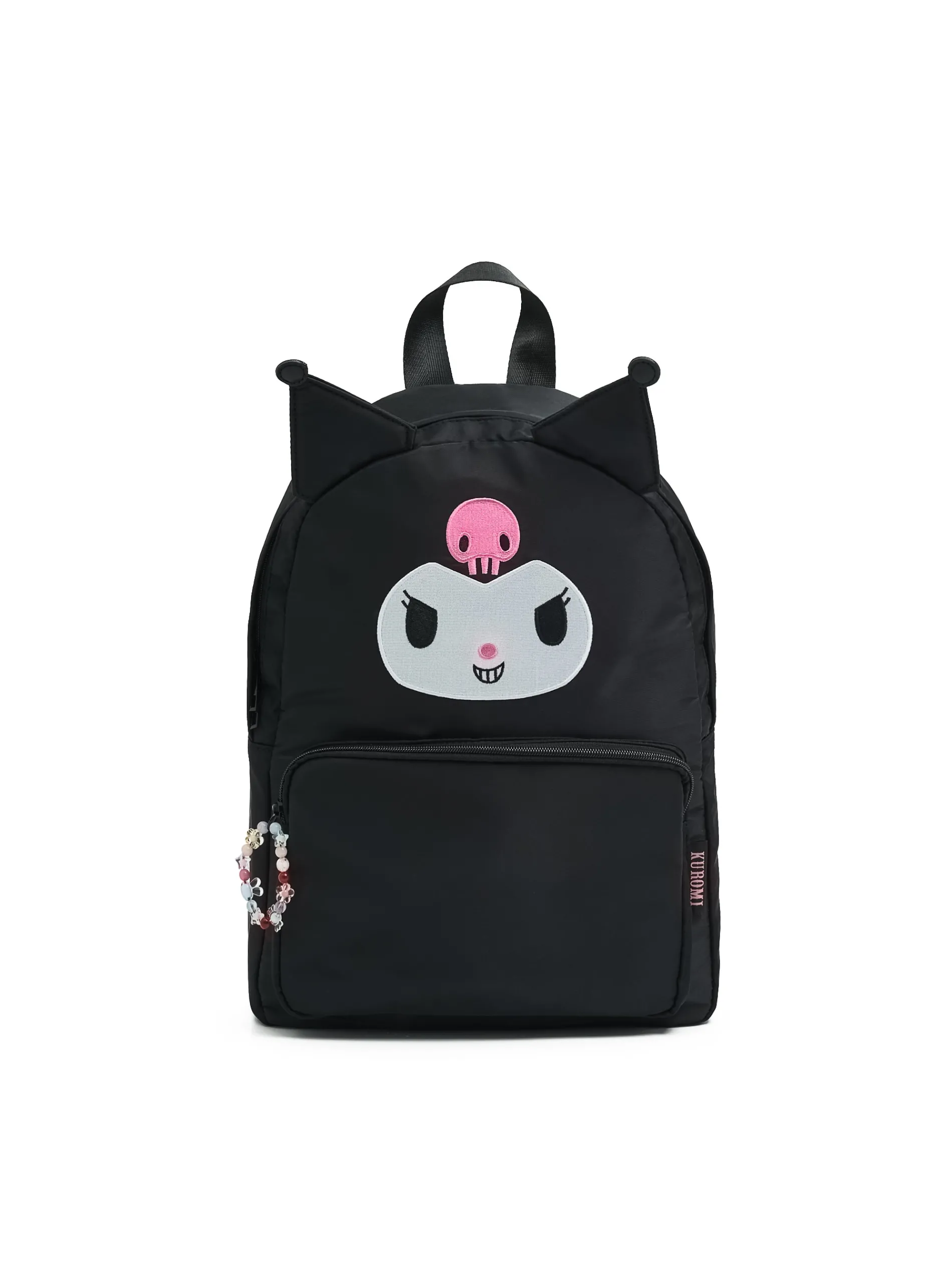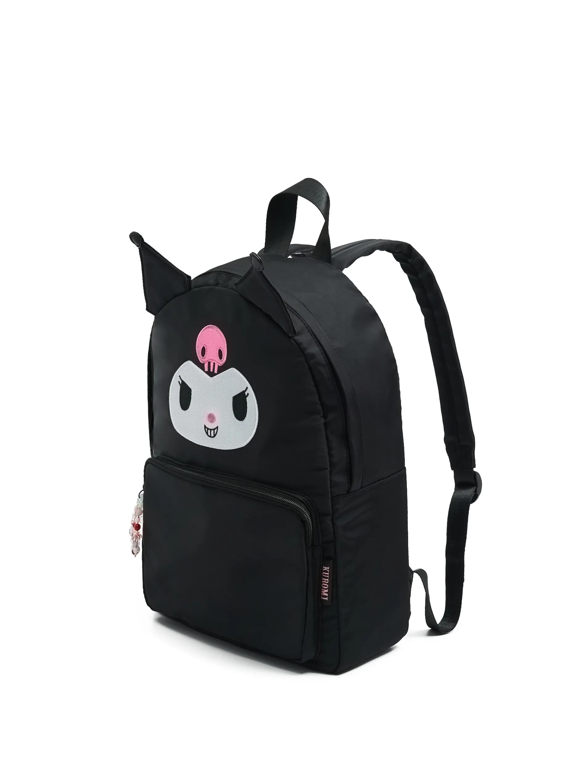 Damski duży plecak, uszyty z wytrzymałej czarnej tkaniny. regulowane szelki główna komora i kieszeń z przodu zapinane na suwaki przy suwaku mniejszej kieszeni biżuteryjna zawieszka wewnątrz kieszeń na laptopa z przodu haft z motywem Kuromi i odstające uszka Wymiary produktu: 43 x 31 x 12 cm © 2024 SANRIO CO., LTD.