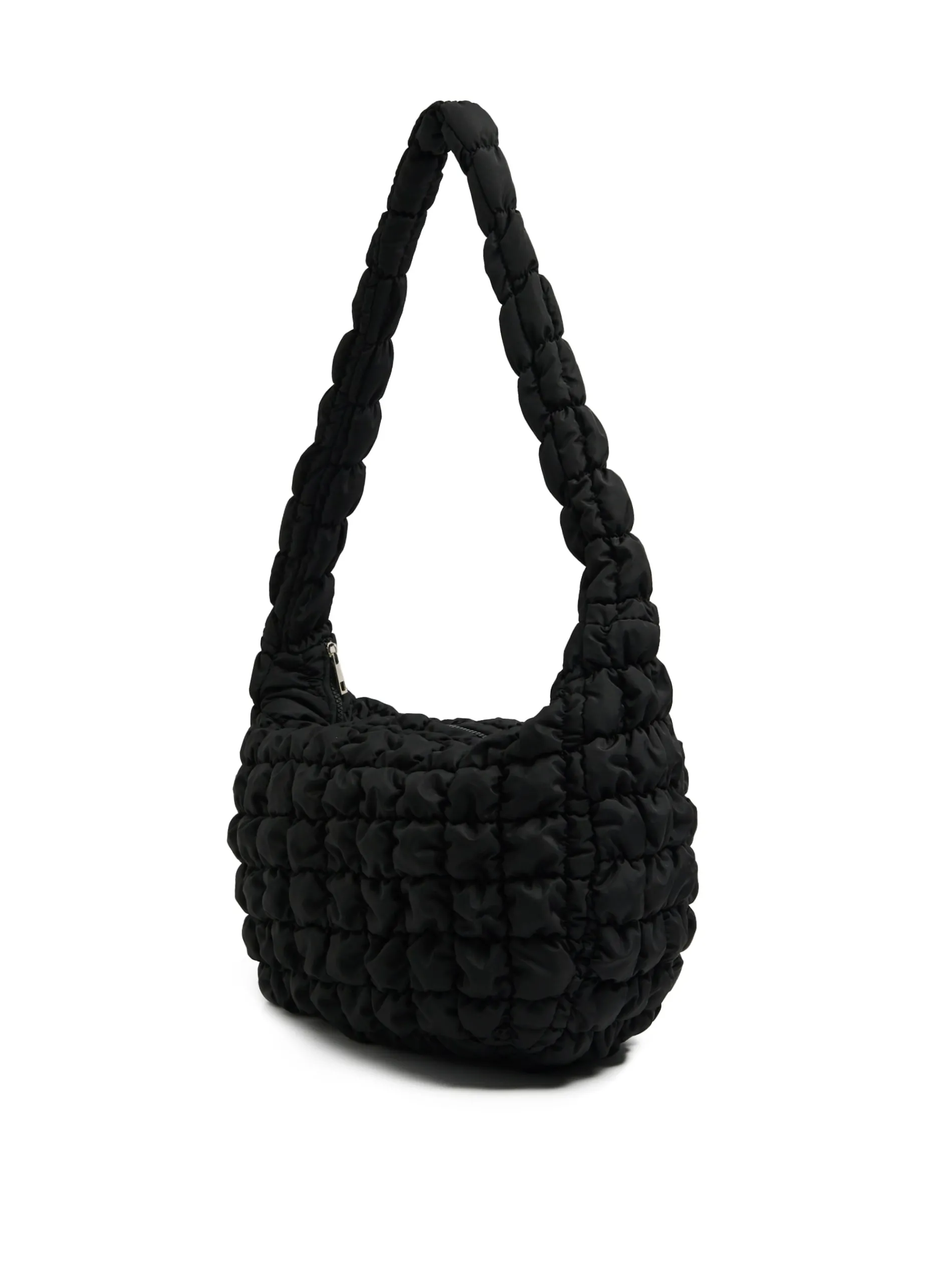 Damska torebka typu hobo uszyta z tkaniny o pikowanym wzorze. Pojemna, główna komora, wewnątrz dodatkowa kieszeń z zapięciem na zamek pikowanie na całości torebka o fasonie hobo długi pasek na ramię główna komora z zapięciem na zamek dodatkowa kieszeń z zapięciem na zamek Wymiary torebki: 60cm x 40cm