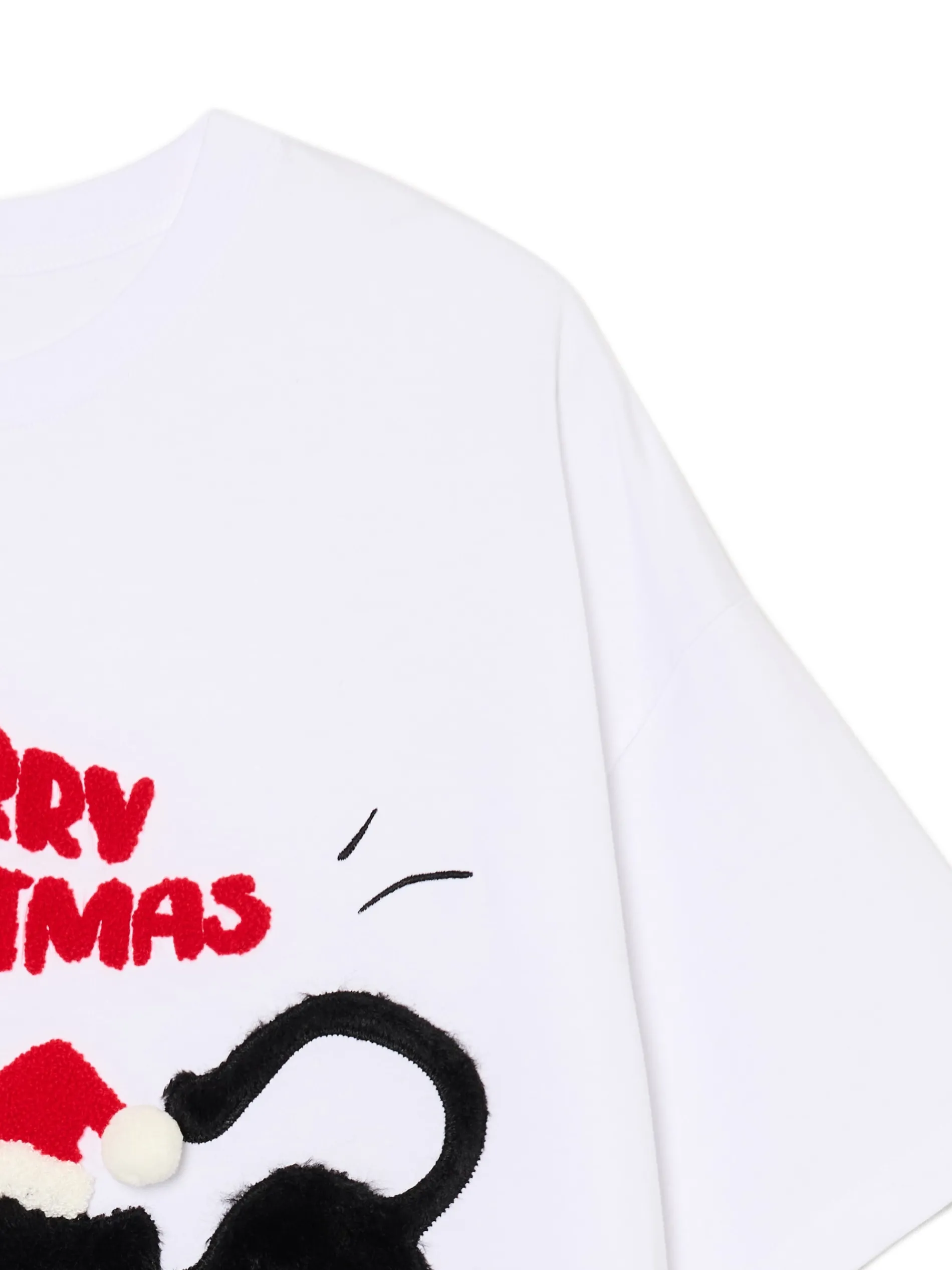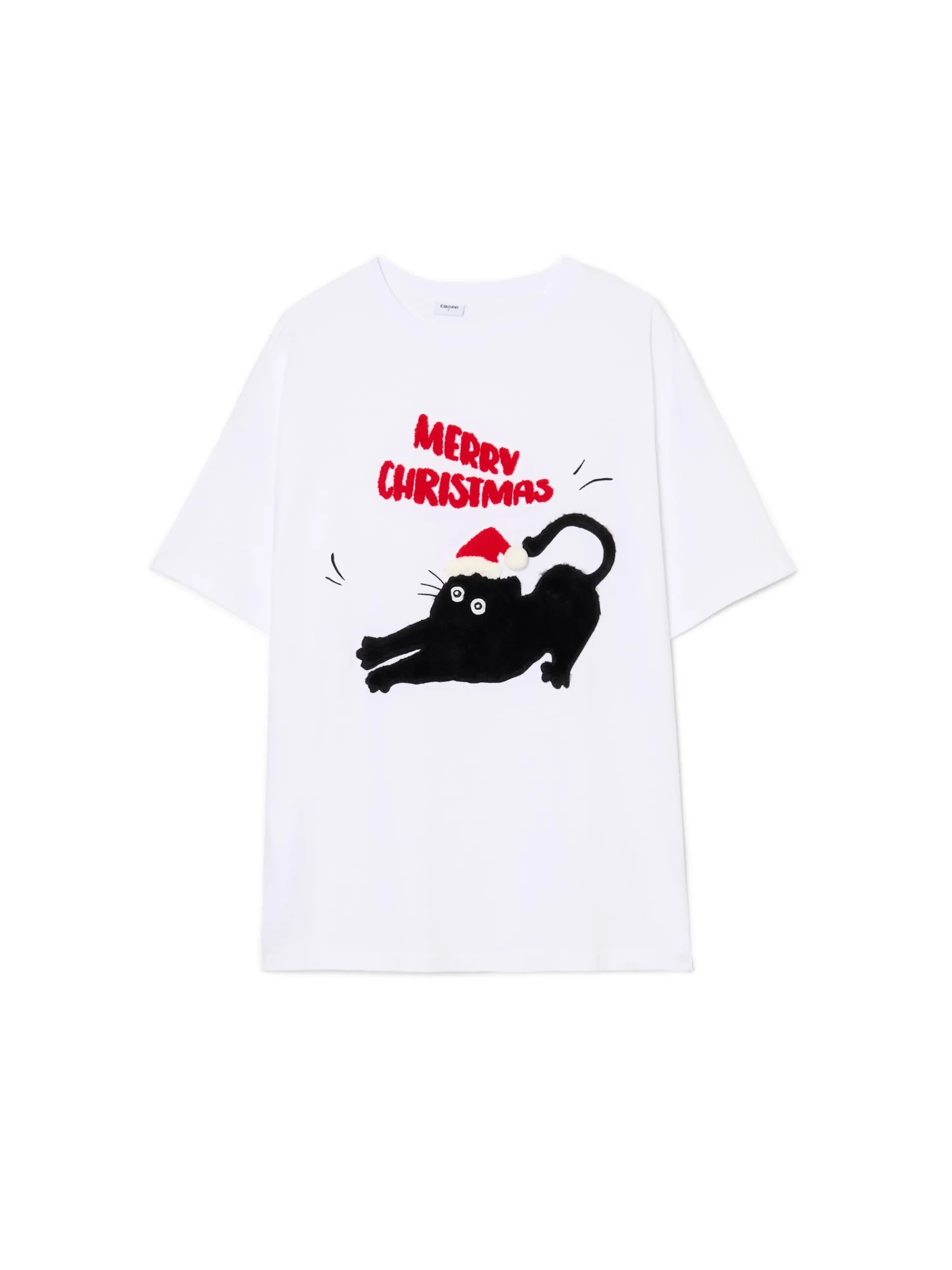 Czarny kot szuka właścicielki! Damski biały T-shirt uszyty z bawełnianej dzianiny z dużą aplikacją na przodzie. Idealny casual na świąteczne meetingi! 100% bawełny oversizowy krój okrągły dekolt z lamówką krótkie, szerokie rękawy z przodu aplikacja Xmas