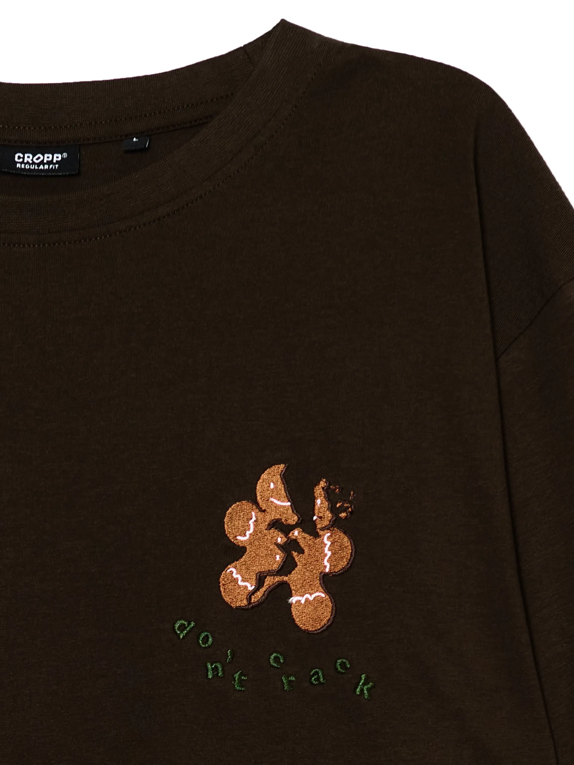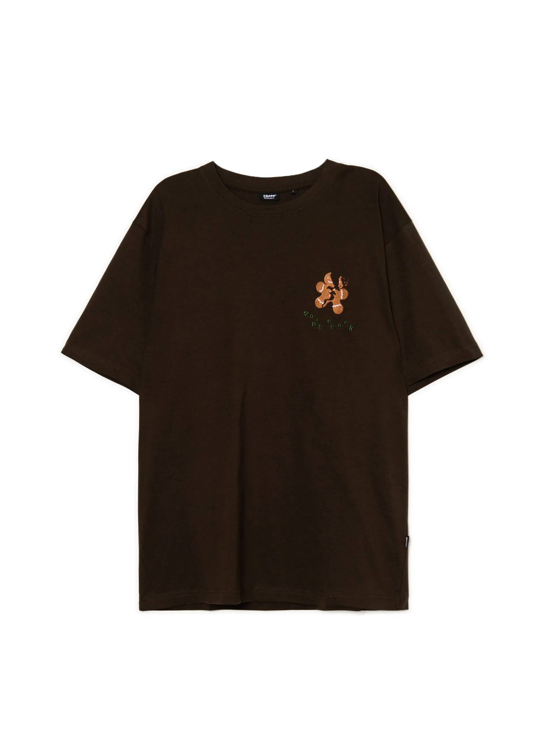 Męski T-shirt z naszywką pierniczka uszyty z bawełnianej dzianiny. Idealny item na świąteczne dekorowanie ciasteczek! 100% bawełny regularny krój okrągły dekolt krótkie, swobodne rękawy z przodu aplikacja Xmas