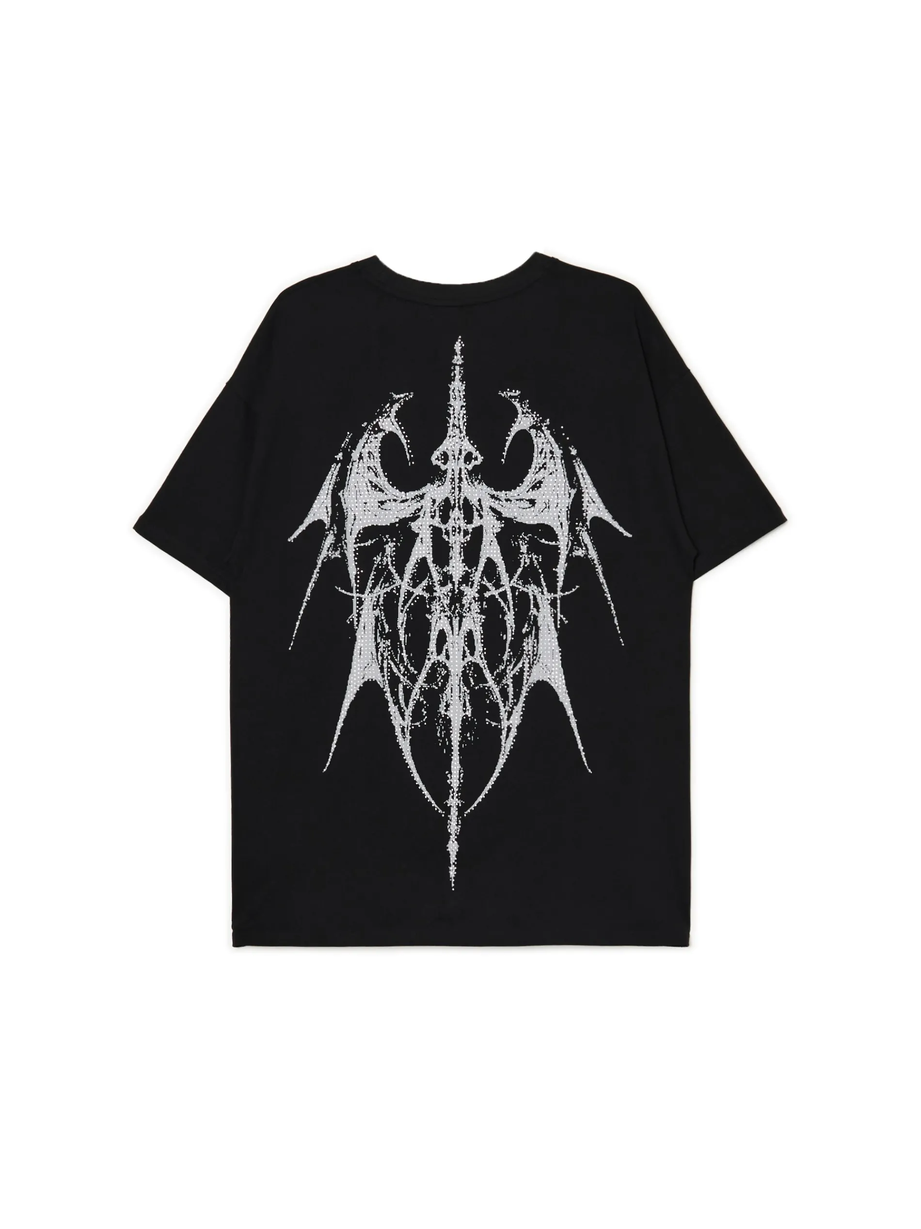 Bawełniana damska koszulka o kroju oversize z napisem z przodu i dużym nadrukiem na plecach. Sztosowy model na wieczorne wypady! 100% bawełny oversizowy krój krótkie, swobodne rękawy tekstowy nadruk z przodu na plecach stylizowany print i błyszczące kryształki Ten produkt należy do kolekcji UNISEX – zalecamy wybranie mniejszego rozmiaru niż zazwyczaj, jeśli chcesz uniknąć efektu oversize.