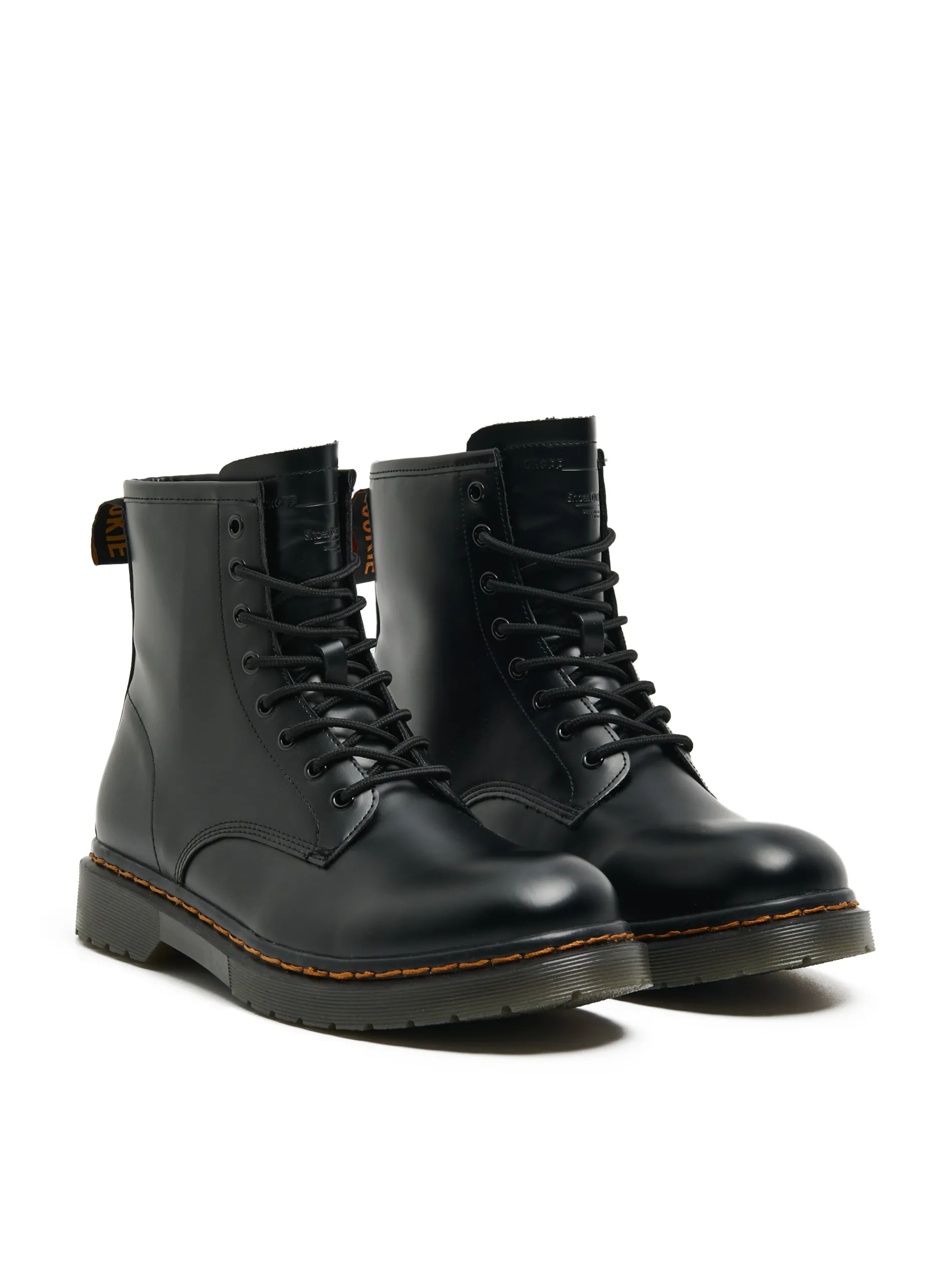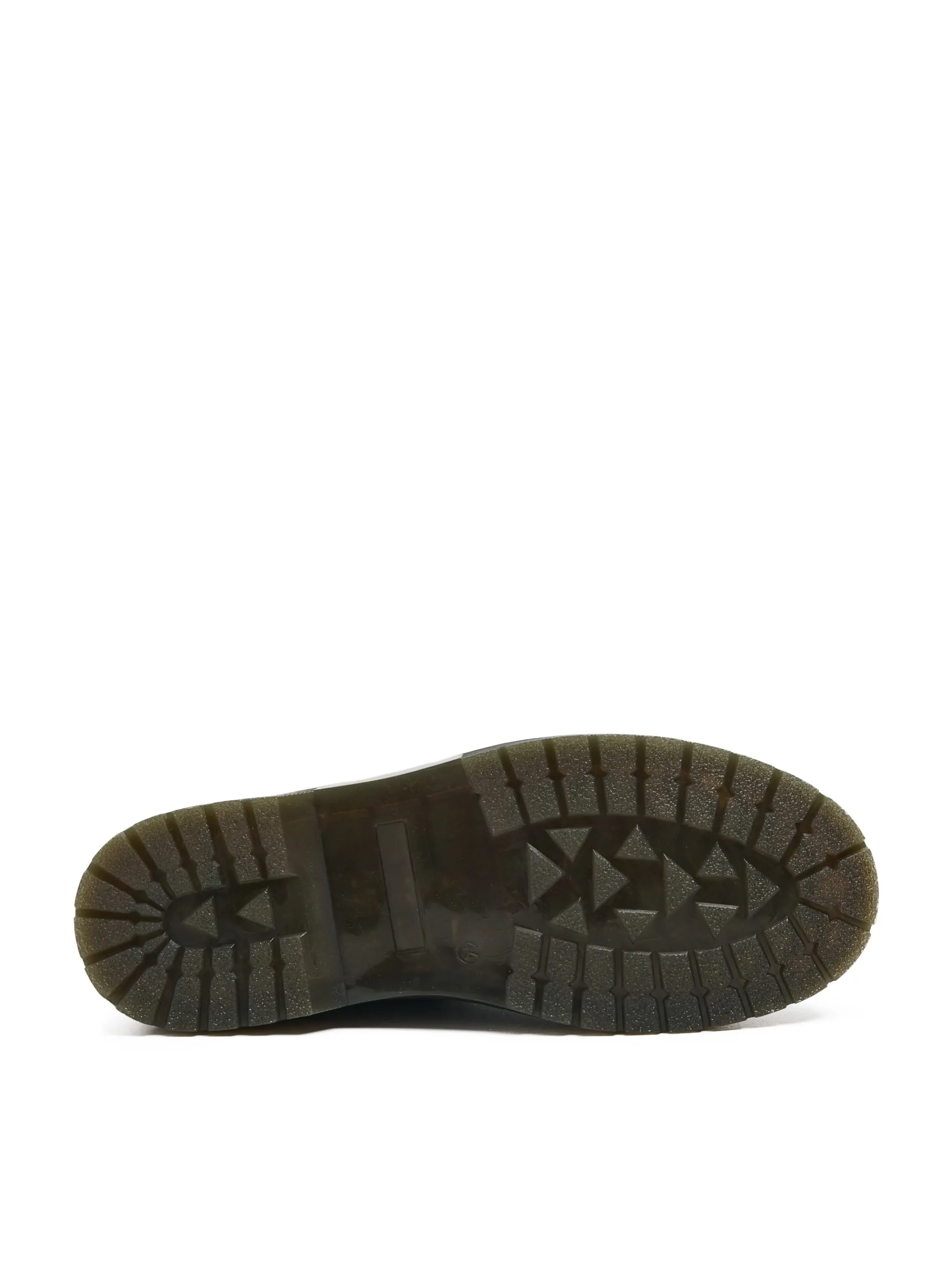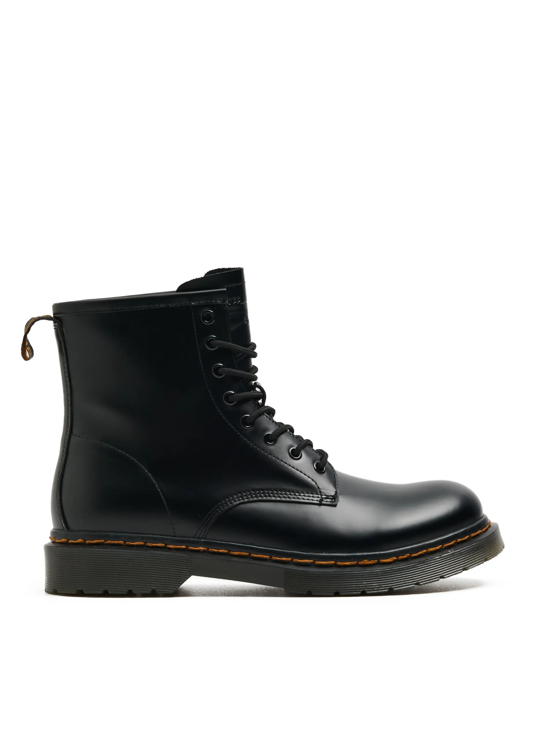 Casualowe męskie czarne trzewiki wykonane ze sztucznej skóry. Dekoracyjne przeszycia przy solidnej podeszwie i naszywki na cholewce, nadają im oryginalnego wyglądu. Metalowe przelotki wzmacniają materiał, a miękka wyściółka zapewnia komfort noszenia. sznurowane trzewiki za kostkę cholewka z imitacji skóry wiązane na czarne sznurówki zaokrąglony nosek gruba podeszwa z termoplastycznej gumy wygodny uchwyt do wkładania i zdejmowania butów ozdobny zewnętrzny szew brandowa naszywka z wykorzystaniem techniki emboss