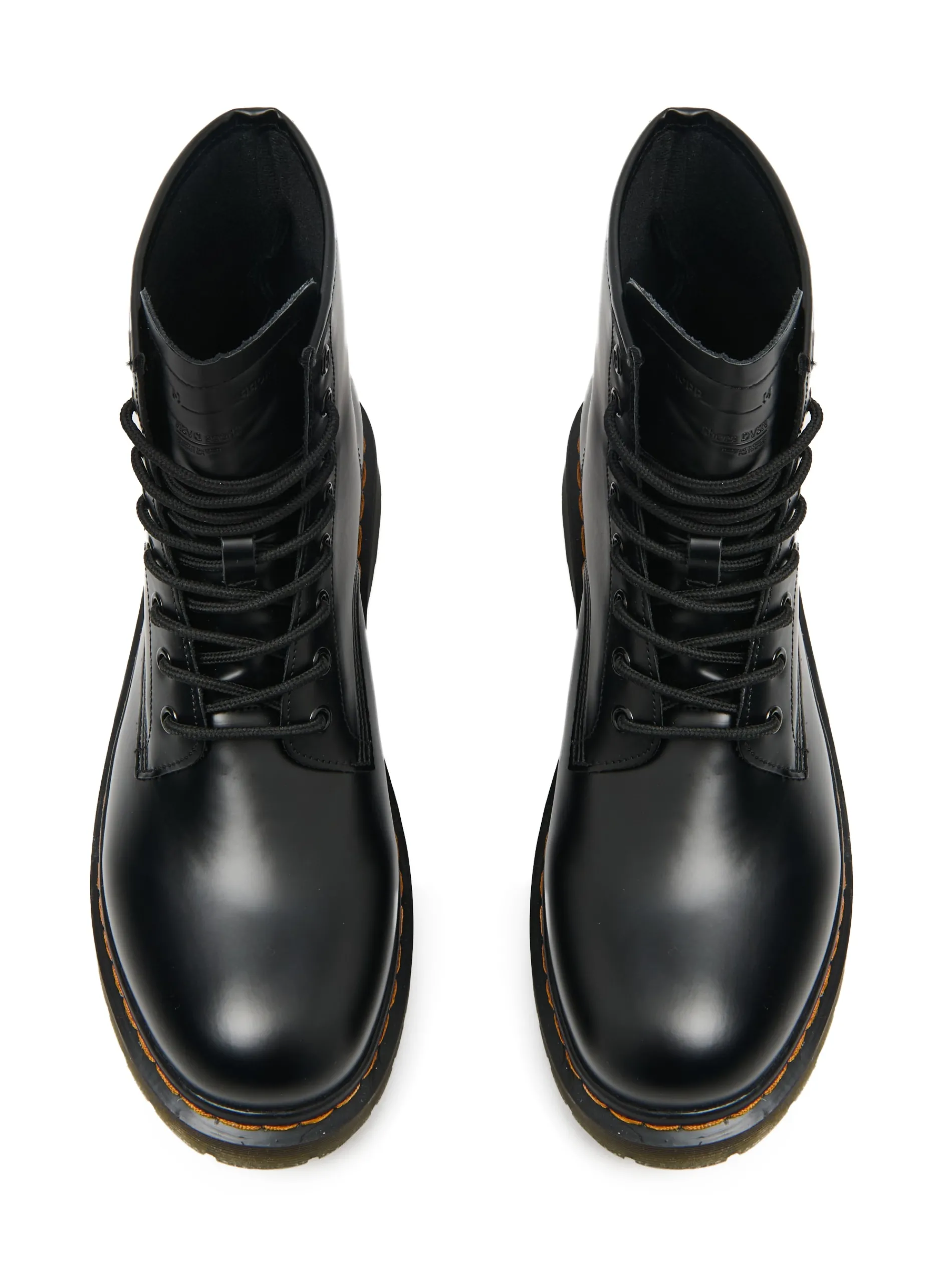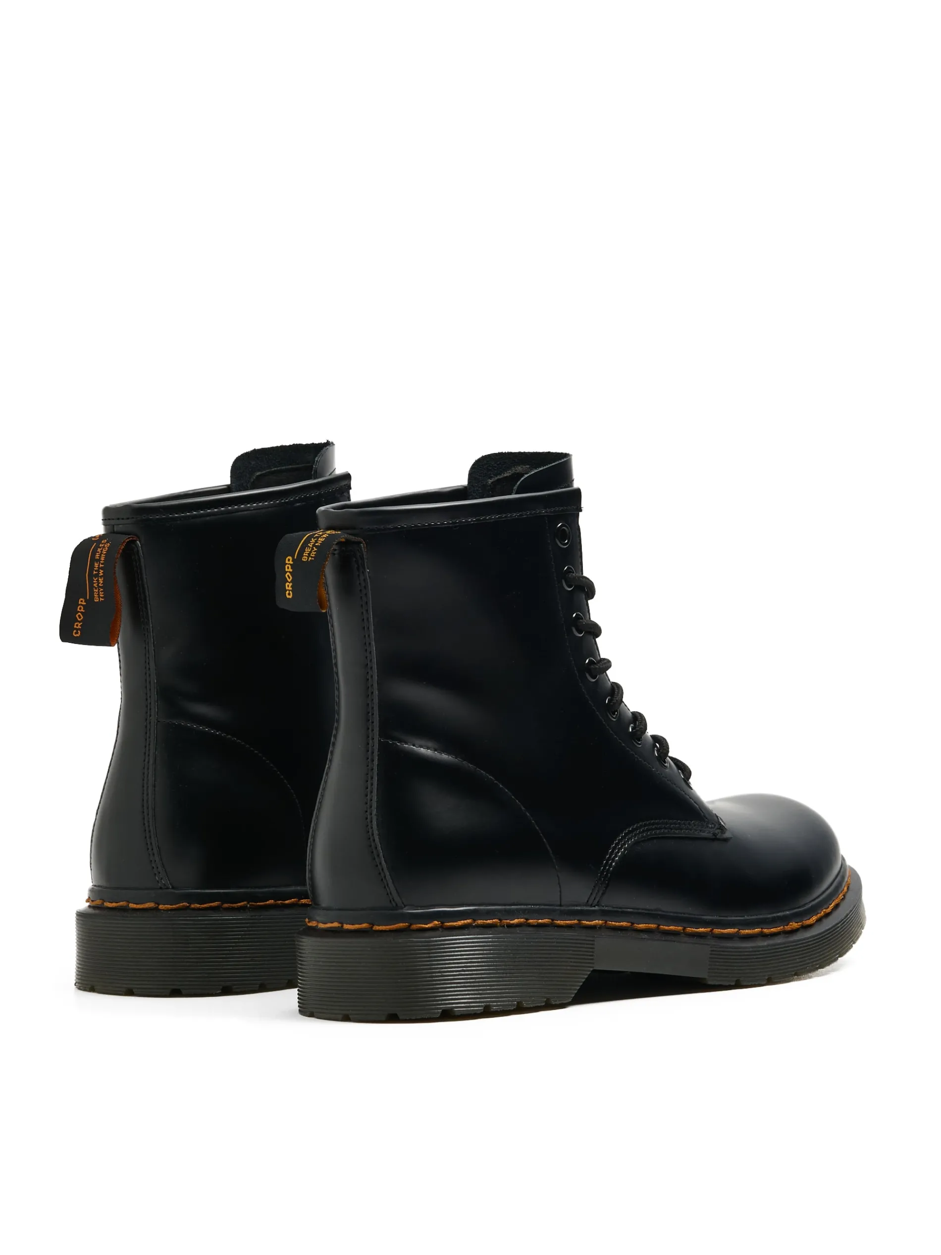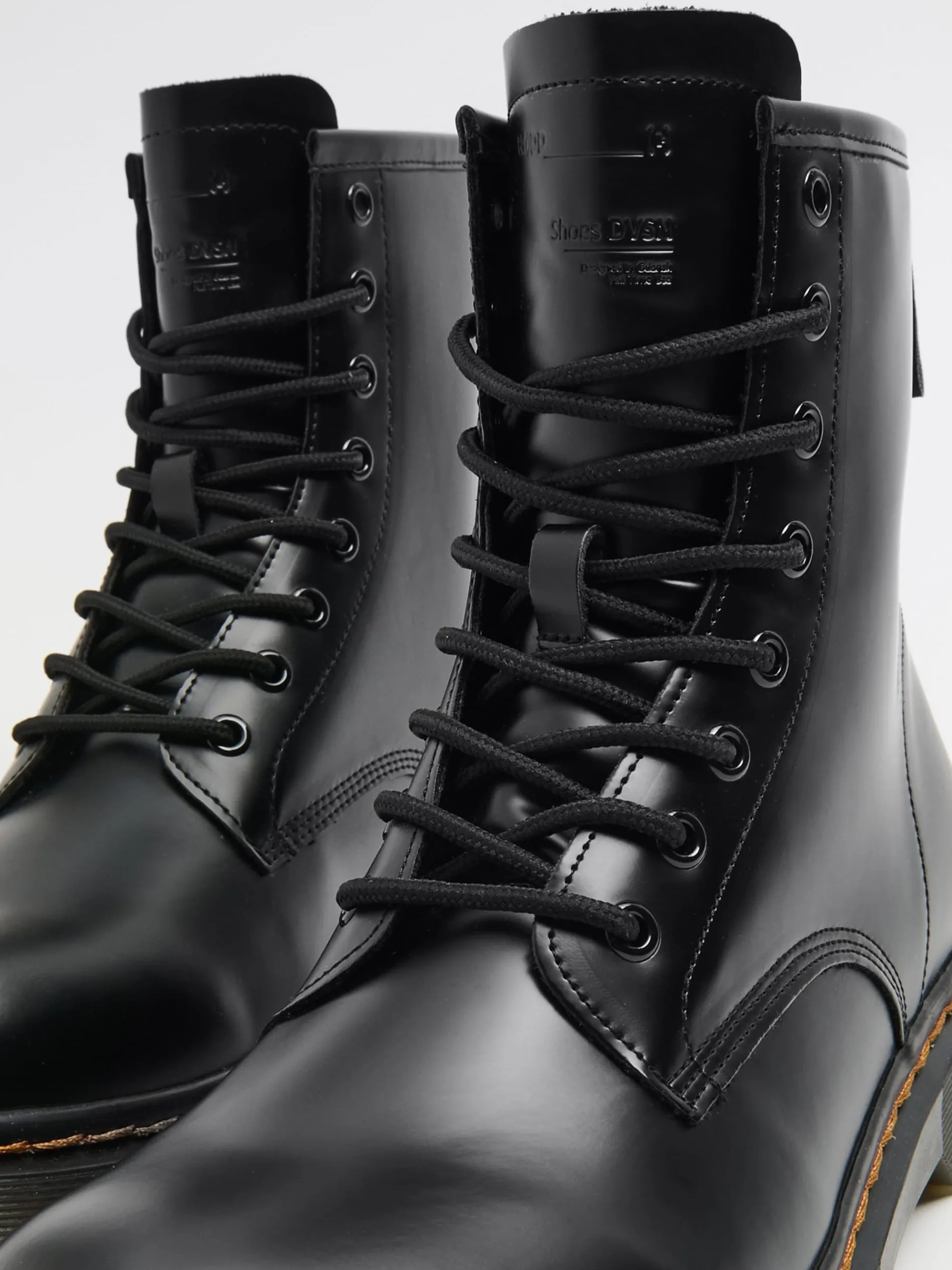 Casualowe męskie czarne trzewiki wykonane ze sztucznej skóry. Dekoracyjne przeszycia przy solidnej podeszwie i naszywki na cholewce, nadają im oryginalnego wyglądu. Metalowe przelotki wzmacniają materiał, a miękka wyściółka zapewnia komfort noszenia. sznurowane trzewiki za kostkę cholewka z imitacji skóry wiązane na czarne sznurówki zaokrąglony nosek gruba podeszwa z termoplastycznej gumy wygodny uchwyt do wkładania i zdejmowania butów ozdobny zewnętrzny szew brandowa naszywka z wykorzystaniem techniki emboss